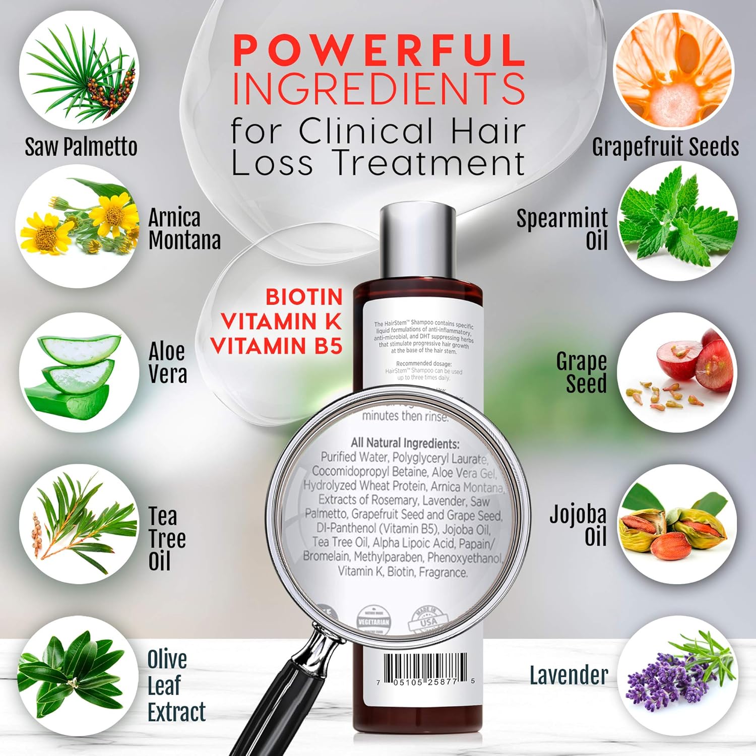 - Clinically developed for hair loss treatments: sulfate free, includes high quality biotin, saw palmetto, tea tea oil, aloe, arnica montana. Our formula is noticeably volumizing, feels and smells great. The hairstem shampoo is infused with powerful vitamins, herbs, and dht blockers ideal for men and women.