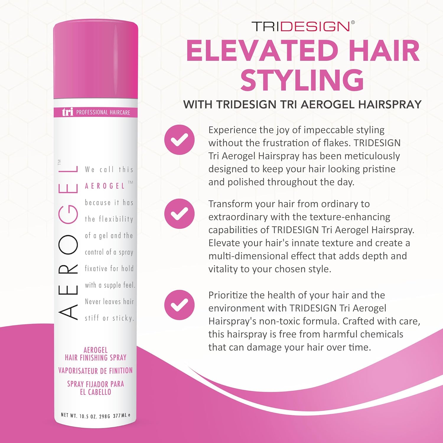 - NO RESIDUE: Tri AEROGEL texturizing hair spray never leaves hair sticky or stiff. It's thick enough to control your hair while light enough to not weigh it down. Take your hair to the next level with our hair spray flexible hold.