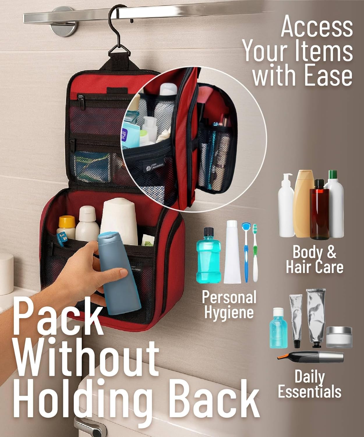 - Convenient Hanging Hook: The XXL metal swivel hook allows you to hang the bag anywhere, saving valuable counter space. It's perfect for use in hotels, bathrooms, or even on a camping trip.
