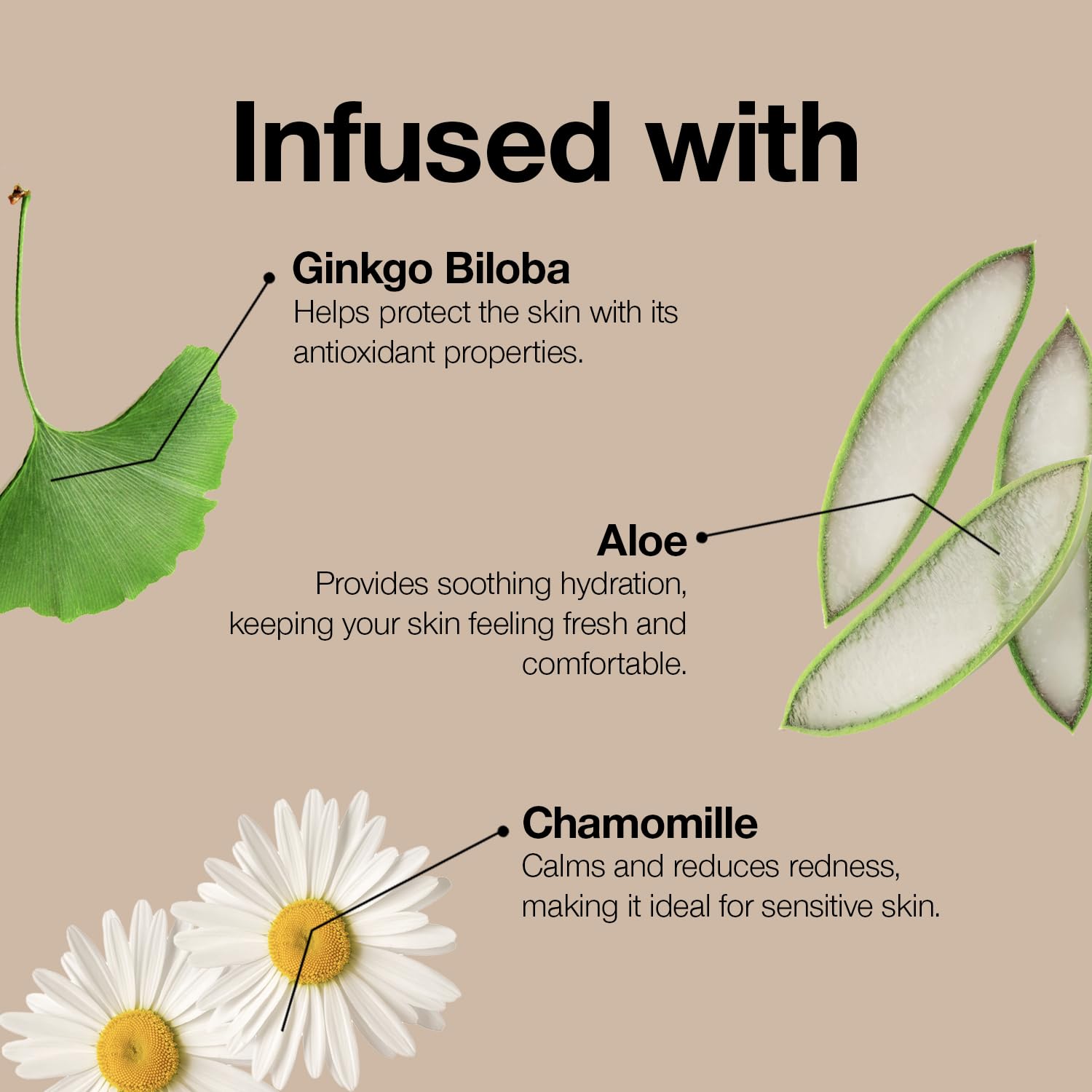 - BOTANICAL AND VITAMIN INFUSED COSMETICS: Infused with apricot, chamomile, ginkgo biloba, aloe (skin conditioning), coconut oil (skin softening) & ginseng