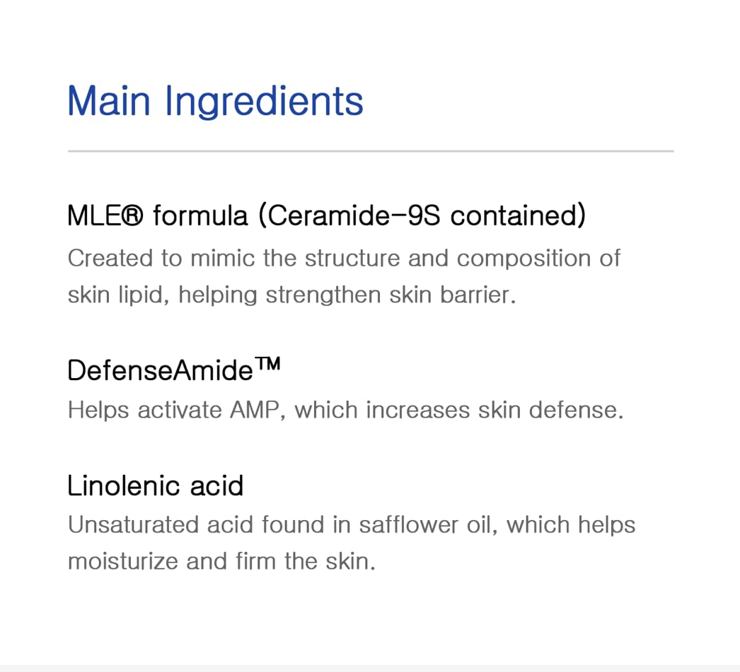- Active Ingredients : Water, Glycerin, Propanediol, Caprylic/capric triglyceride, Cetearyl alcohol, Sorbitan stearate, Carthamus Tinctorius (safflower) seed oil, Glyceryl stearate, Stearic acid, Myristoyl/palmitoyl oxostearamide/arachamide MEA(Ceramide), Methyl caprooyl tyrosinate(Defensamide), Phytosterols, Tocopheryl acetate, Bisabolol, Xanthan gum, Sodium hyaluronate, Dimethicone, 1,2-hexanediol, Caprylyl glycol, Tropolone Water, Glycerin, Propanediol, Caprylic/capric triglyceride, Cetearyl alcohol, Sorbitan stearate, Carthamus Tinctorius (safflower) seed oil, Glyceryl stearate, Stearic acid, Myristoyl/palmitoyl oxostearamide/arachamide MEA⦠See more