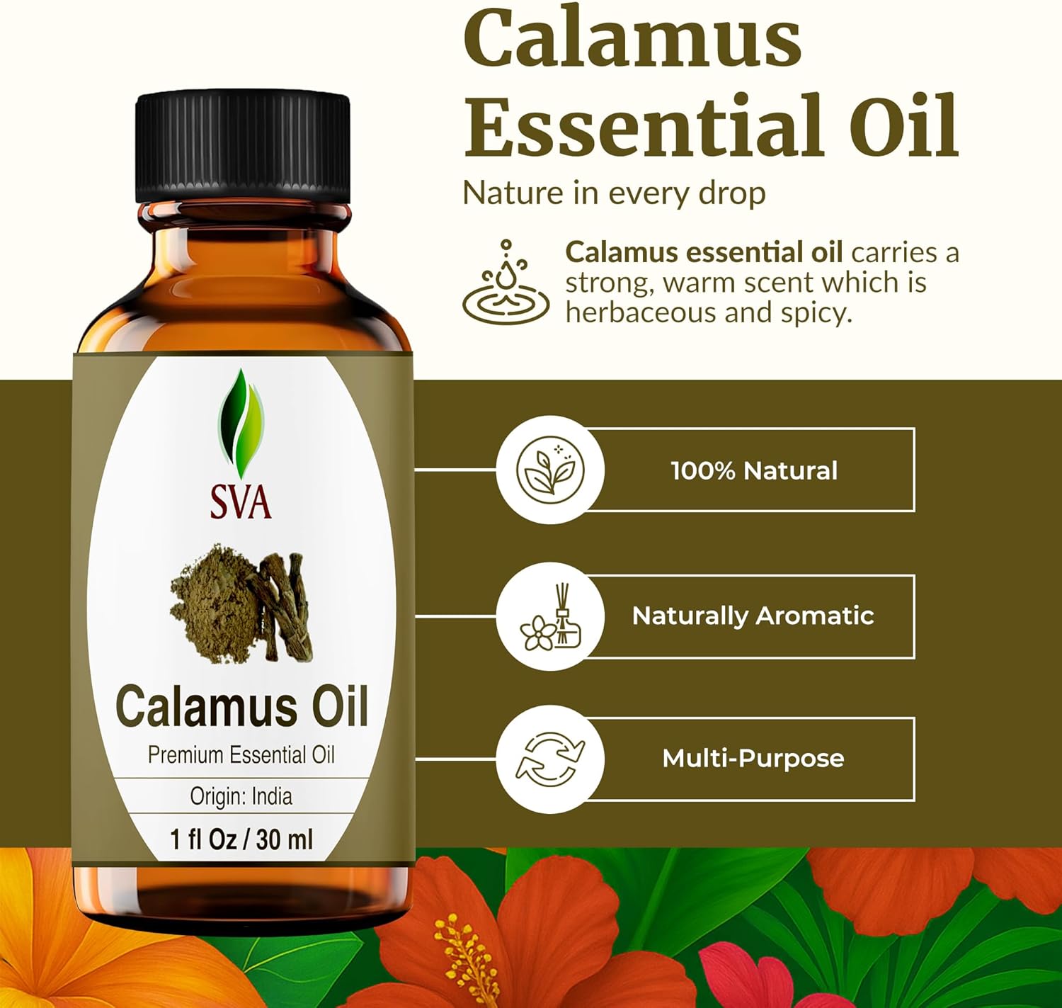 - Premium Quality Calamus Essential Oil: SVA Calamus essential oil 1 Fl Oz is obtained by steam distillation of Calamus plant stems. Our Calamus essential oil is free of preservatives and comes with a dropper for easy application. It is not tested on Animals. We care for you