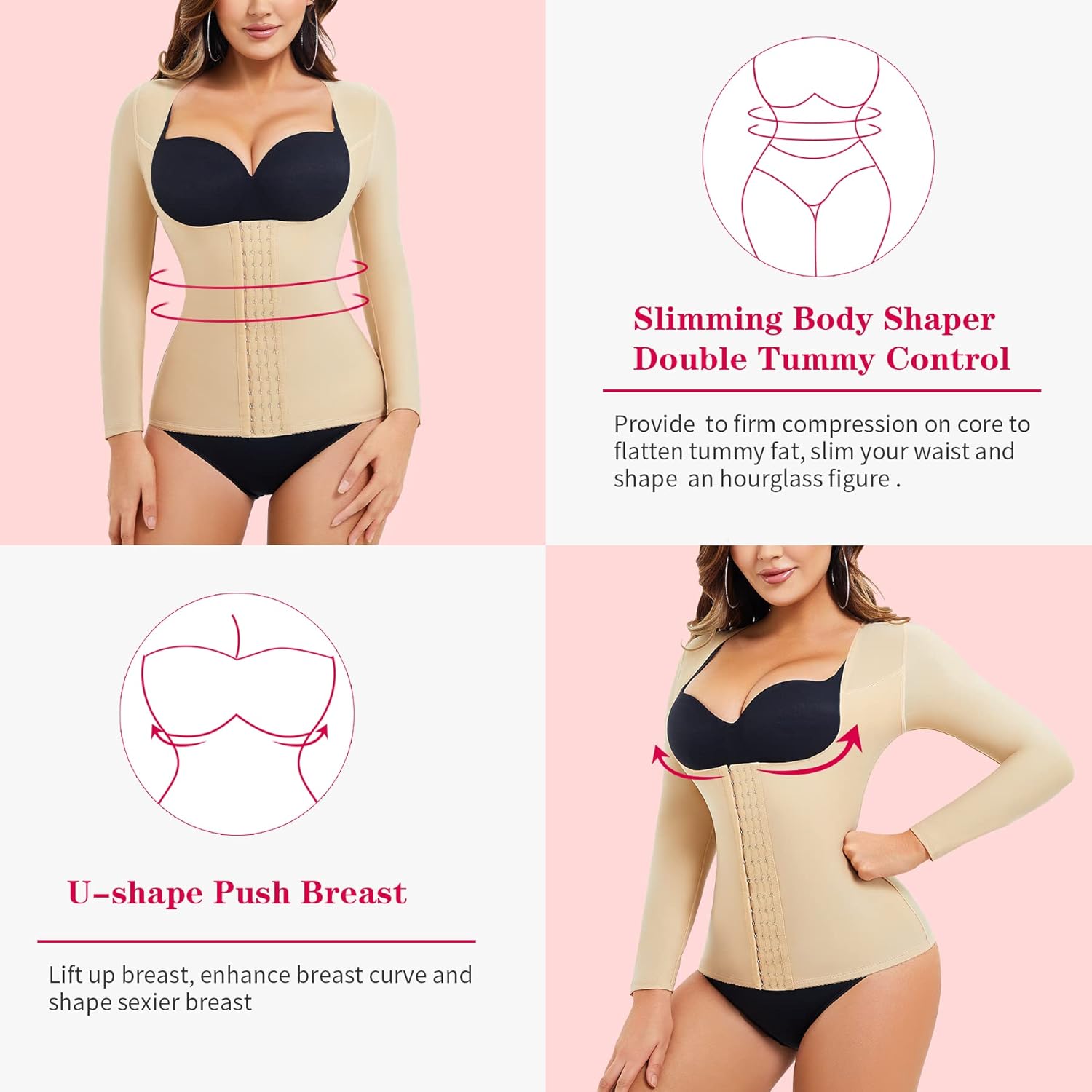- UPPER ARM SHAPER COMPRESSION : Our waist training corset design with high stretchable long sleeve, best for arm liposuction recovery to tighten loose skin, smooths and tights bumps and bulges, reduce arm and back flab, hide your back rolls, give your a slimmer figure. If you no need too tight,we suggest you to have the bigger size.