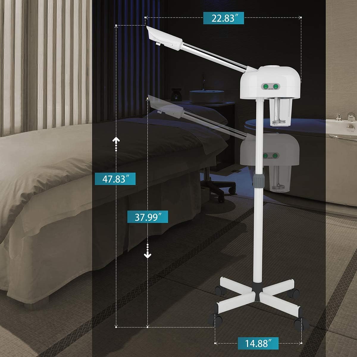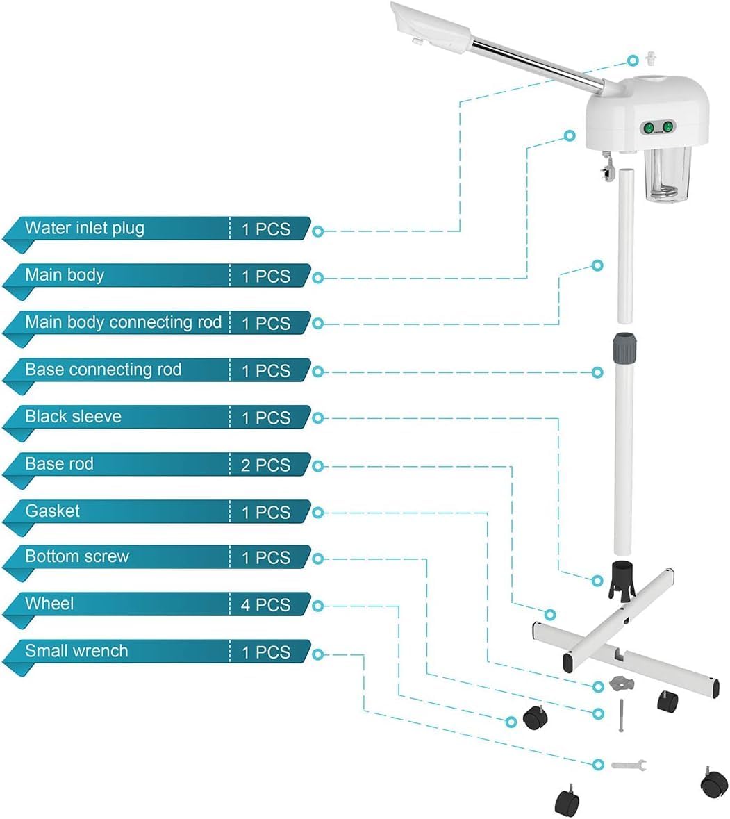 - β EXQUISITE WORKMANSHIP : Titanium atomizing disc, more foggy, more fine, can extend spraying time. High quality SS pipe, sturdy and durable, no rust. Thicker high capacity water cup, can store 600ml water. The head of the machine is free to rotate 360Β°. Adjustable height from 38.1" - 46.4". Easy moving with universal wheels.