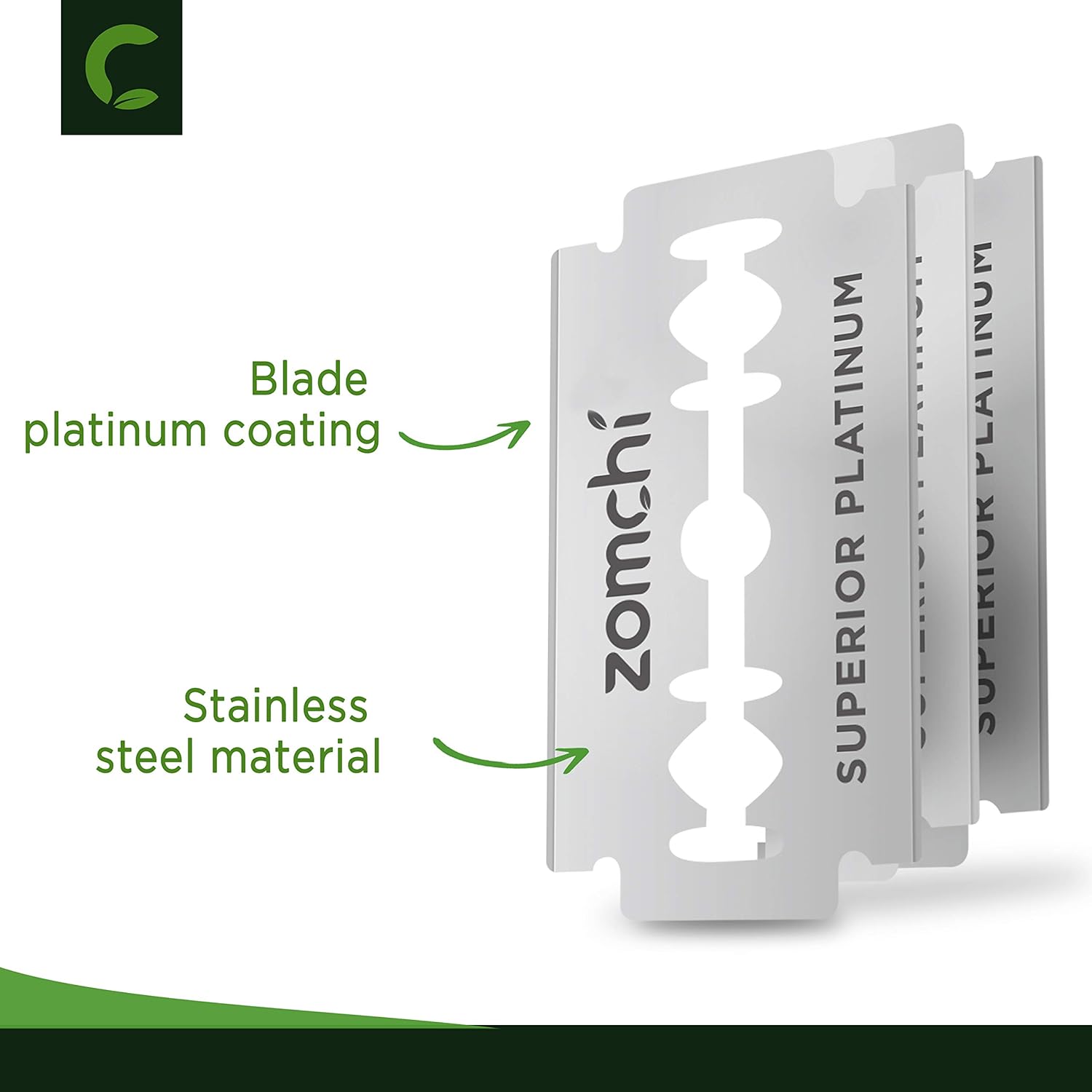 - SUPIRIOR PLATNUM FOR DURABLITY: With Exquisite workmanship, Zomchi double edge razor blades will not easily rust as they are made of stainless steel with rust-resistant coatings. Besides, its smooth surface makes it easy to wash hair away after shaving.