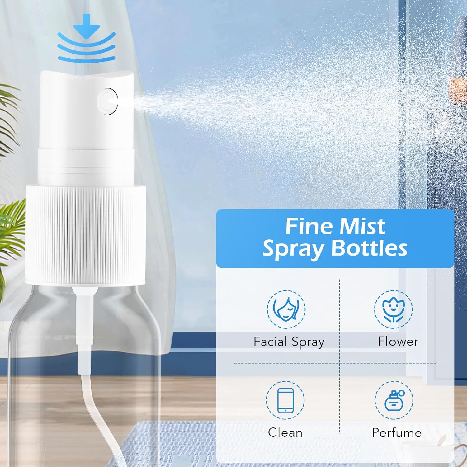 Spray Bottles, 2oz/50ml Clear Empty Fine Mist Plastic Mini Travel Bottle Set, Small Refillable Liquid Containers with 2pcs Funnels and 24pcs Labels (6 Pack)