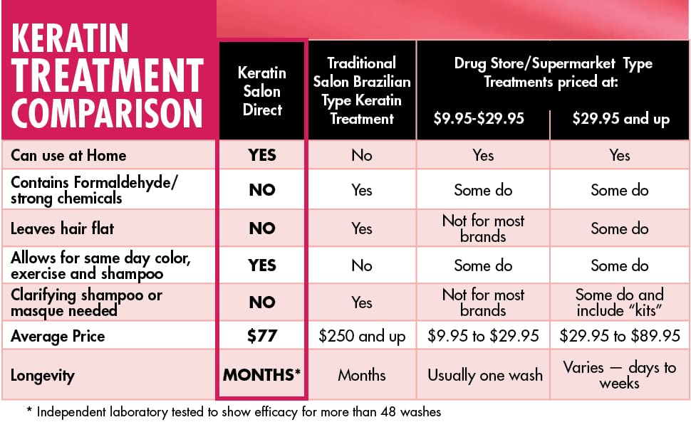 - DELIVERS SALON QUALITY RESULTS AT HOME, SAFELY and EFFECTIVELY: Keratin Salon Direct provides comparable results to traditional salon Brazilian-type keratin smoothing treatments when it comes to removing frizz and smoothing hair β but without the harmful chemicals. And, because KSD works from the inside out to strengthen and fortify hair, results with KSD mean hair is not only smoother, but also healthier looking and more manageable.