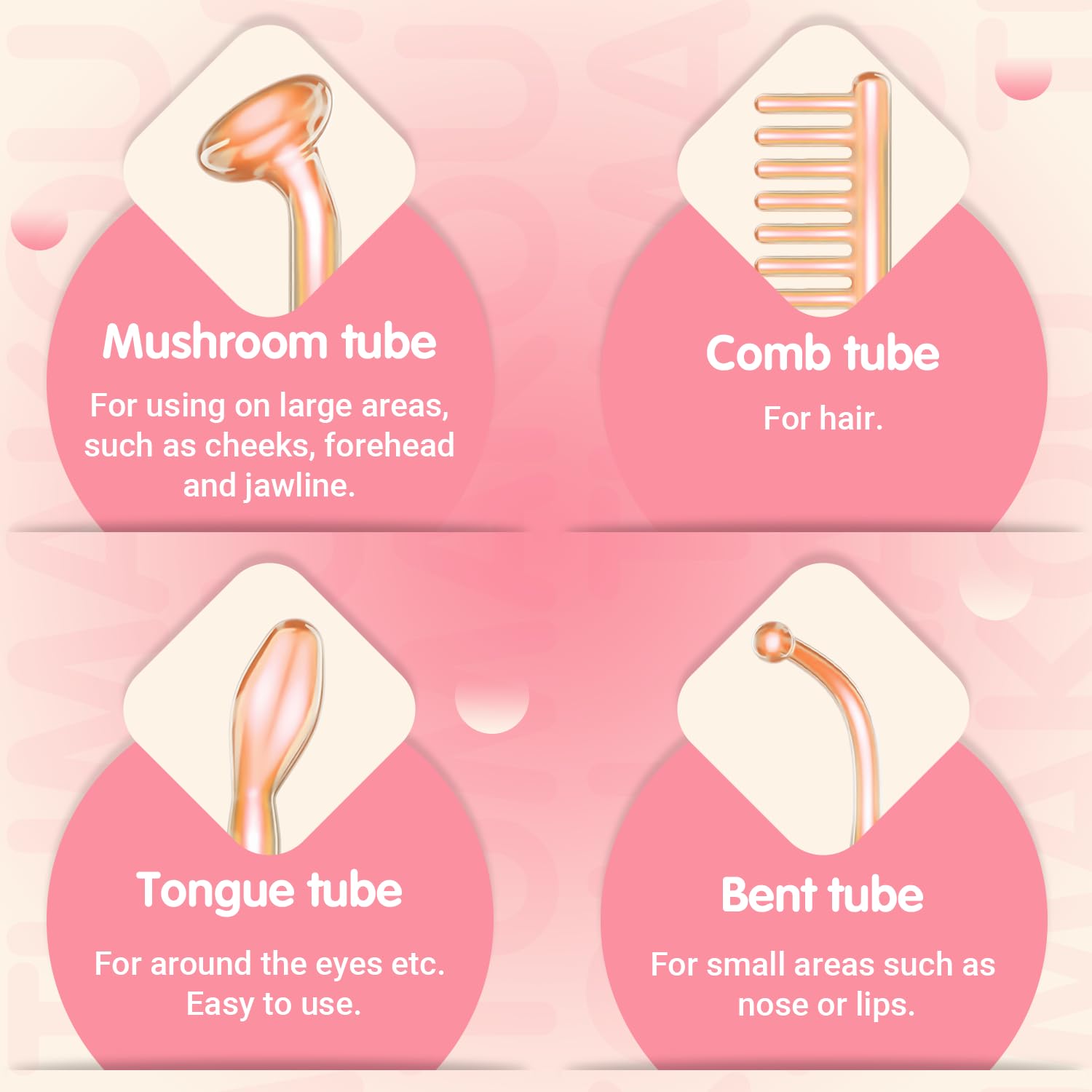 - 4 Different Tubes for You: The portable high frequency facial skin wand has 4 different glass tubes for your needs in different area. 1 Mushroom tube. 1 Tongue tube. 1 Bent tube. 1 Tube