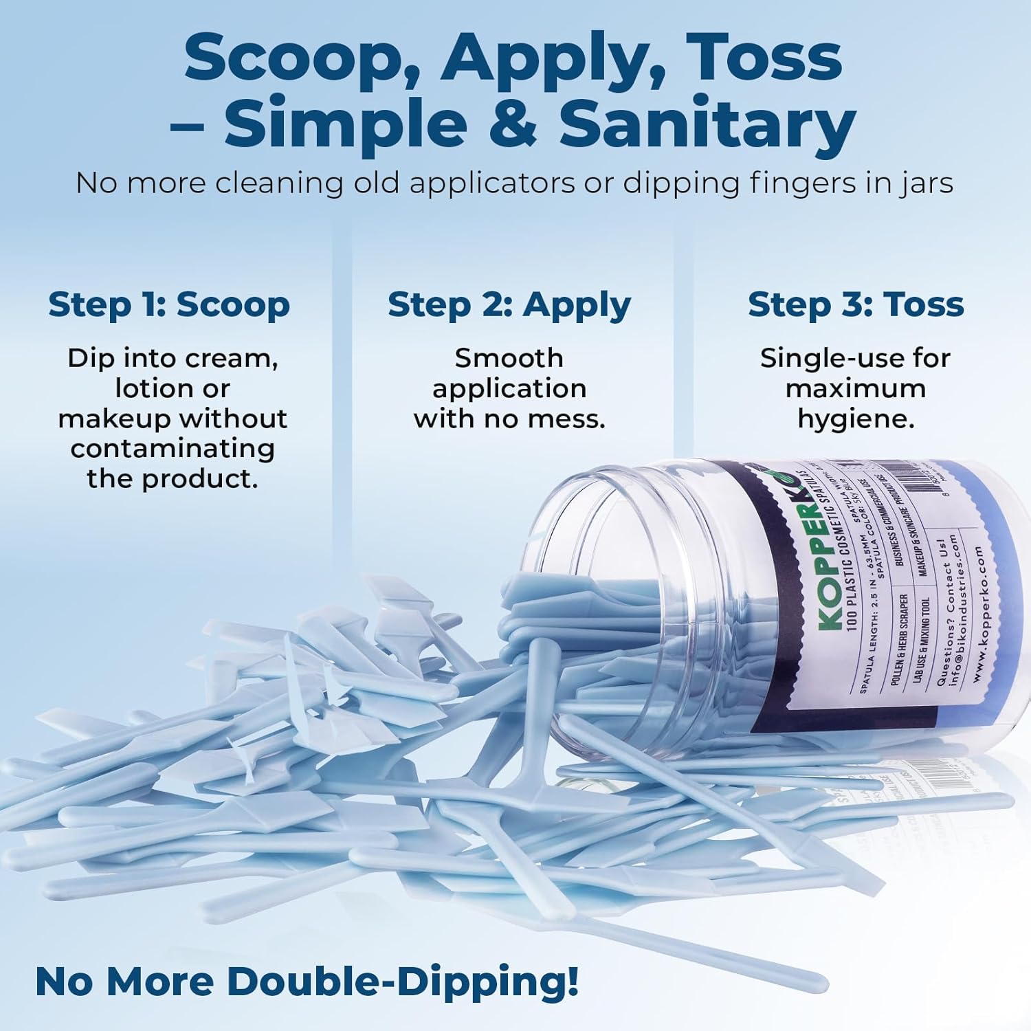 - Clean Out Your Containers: Maximize product use with our 100 pack of 0.25"x2.5" disposable makeup sample spatulas. Easily extract creams, lotions, or makeup from containers, even in tight spaces, without getting product under your nails
