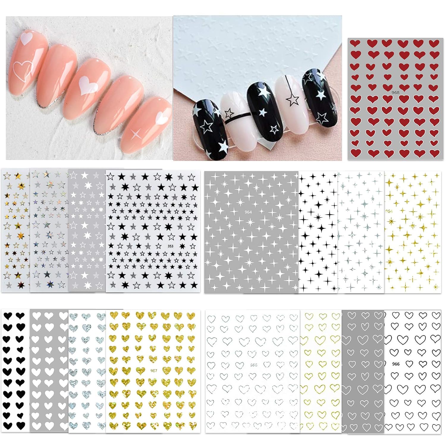 - There are two kinds of star designs and two kinds of star designs. Each design has 4 different colors - black, white, laser gold and laser silver. Besides, there is also a sheet of red heart nail stickers. Perfect for women to DIY their own nail styles as they like.