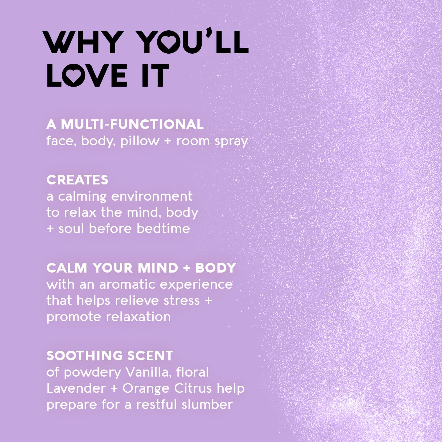 - Multipurpose Sleep Spray: Versatile face, body, pillow, and room spray; designed to promote relaxation and a restful night’s sleep