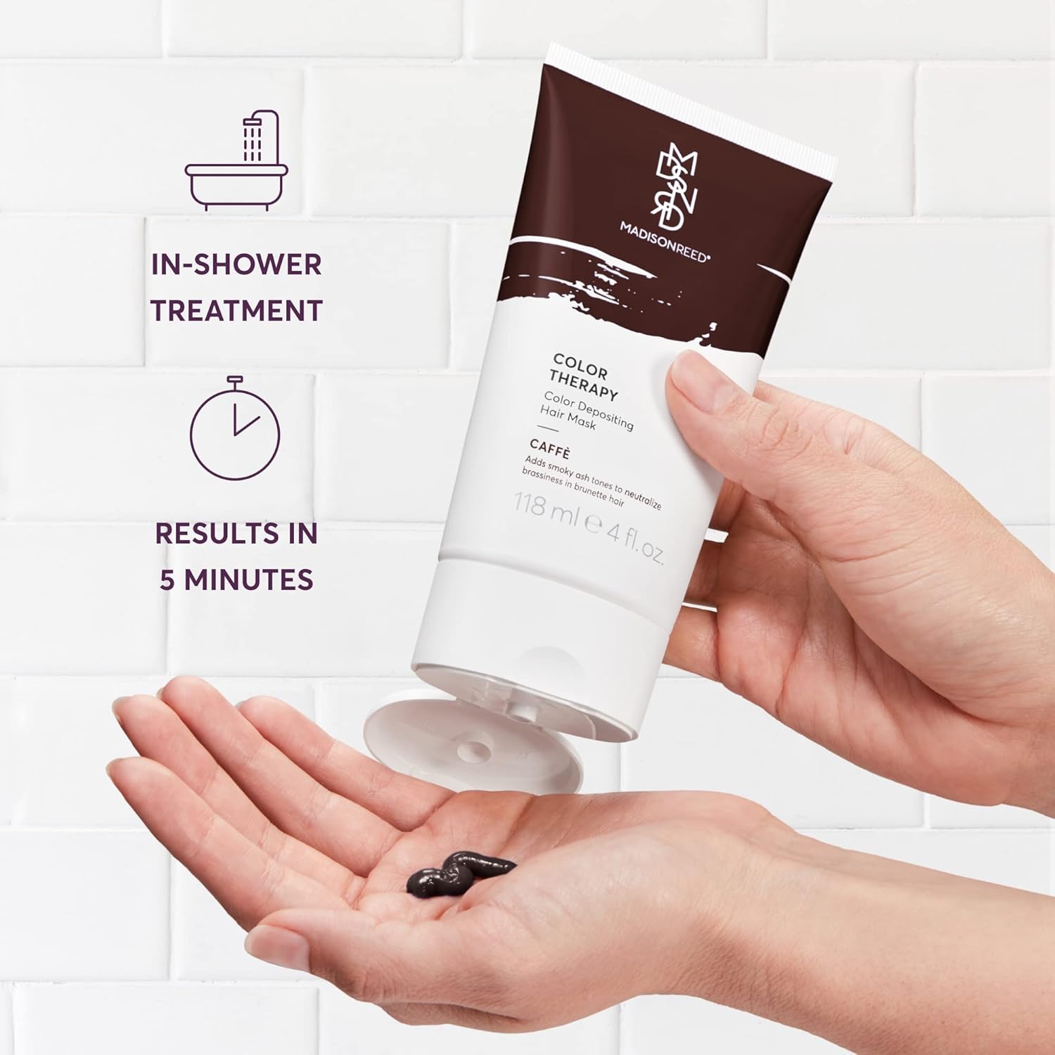- COLOR DEPOSITING HAIR MASK: Madison Reed Color Therapy in Caffรฉ works best on light to dark brown hair, as well as rich chocolate brunettes, and adds smoky ash tones to neutralize brassiness and unwanted orange & red tones. Not intended for gray coverage.