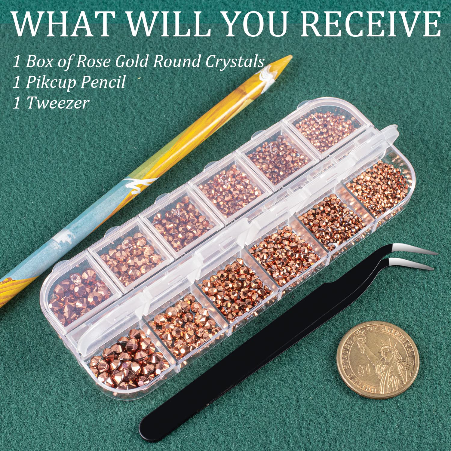 - ❤WHAT YOU WILL RECEIVE -- 1 Box of 6 Sizes Rose Gold Round Glass Nail Crystal Rhinestones Beads (Totally About 1720 PCS); 1 PCS Rhinestone Picker Pencil; 1 PCS Tweezer. The Well Equipped Rhinestone Set Is Suitable for Both Professional Nail Technician and Inexperienced Starter for Nail Art.