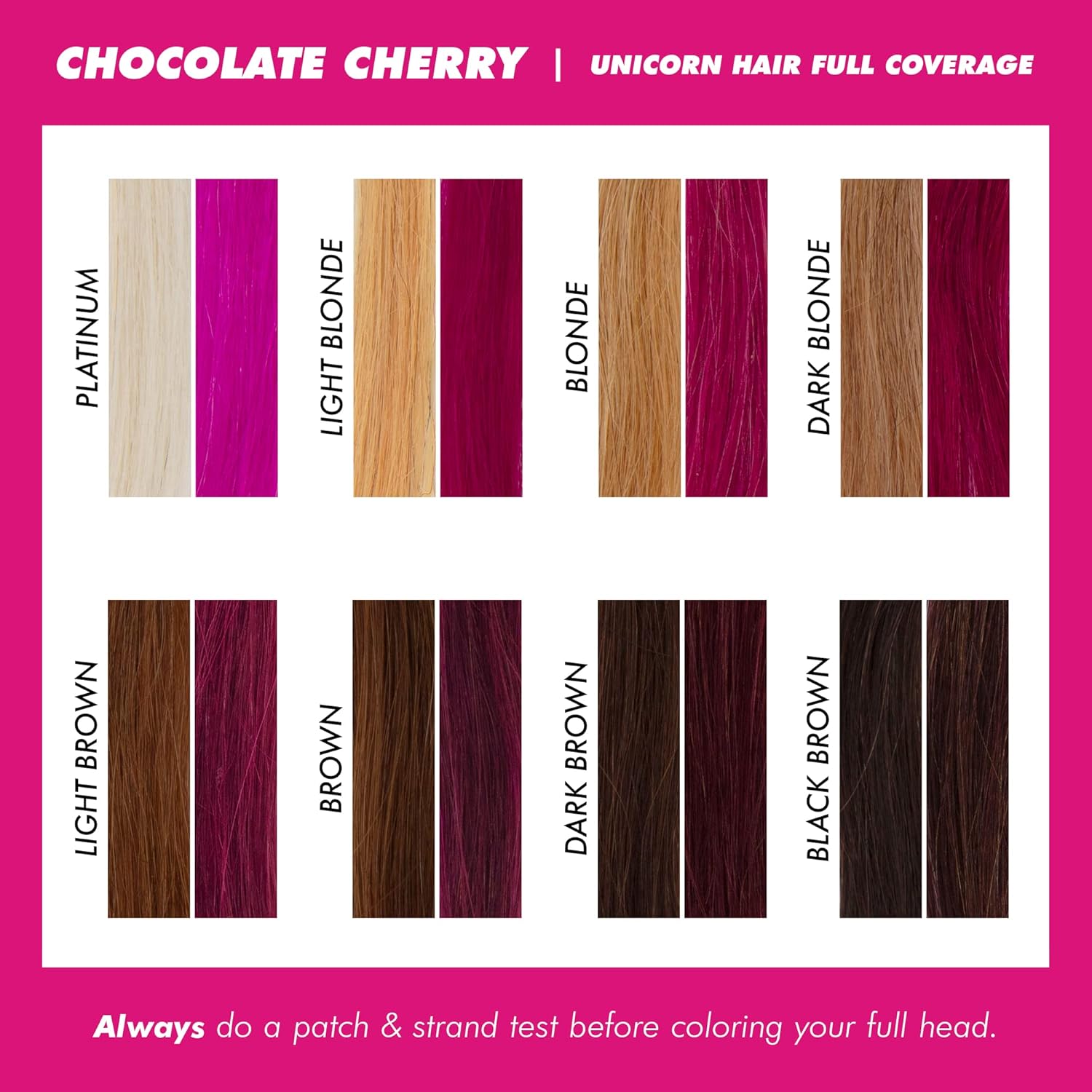 - Chocolate Cherry Unicorn Hair Dye: Dyed and gone to Unicorn Heaven! Lime Crime Unicorn Hair is a DIY-friendly, semi-permanent color dye that transforms hair into vibrant colors... all from the comfort of your own home. Chocolate Cherry is a beautiful burgundy red color that will make your fantasy hair color dreams come true, and its sugary citrus vanilla scent will make your transformation even sweeter!