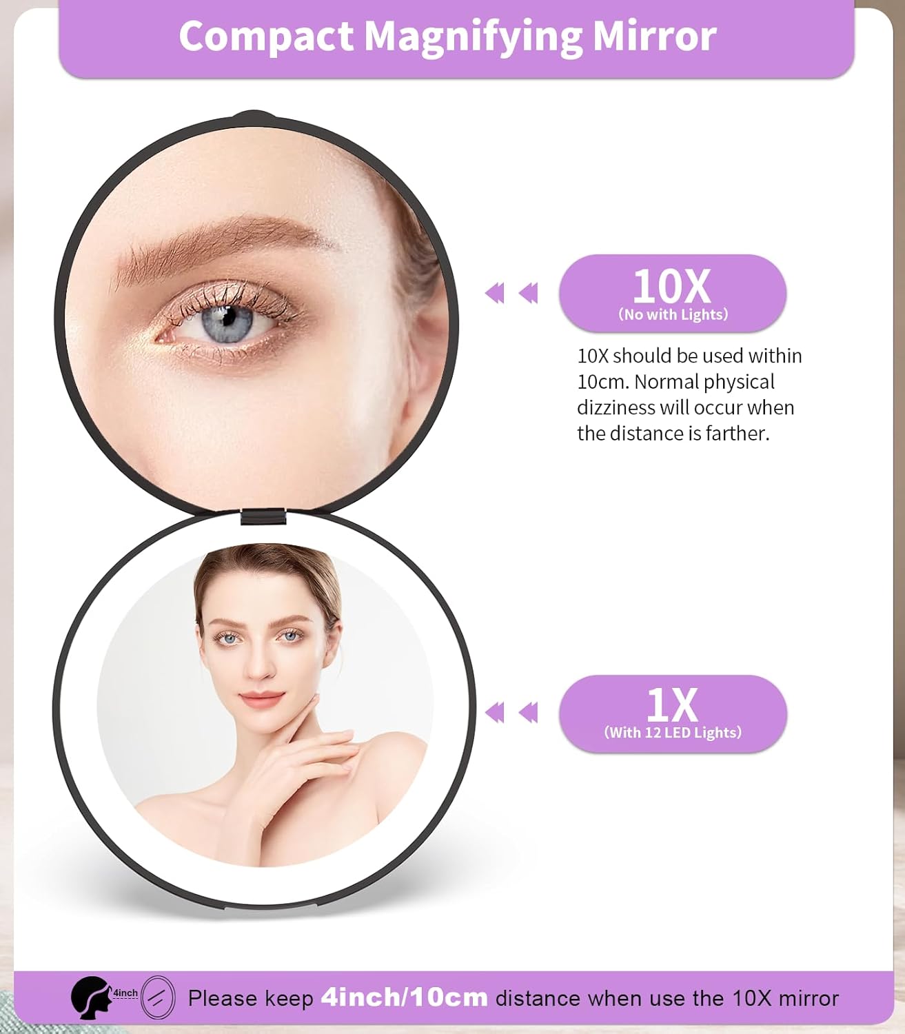 WOBSION Travel Compact Mirror,Portable 1x/10x LED Makeup Mirror with Magnification,Handheld 2-Sided Pocket Mirror, 3.5in Small Mirror for Purse,Handbag,Gift,Black