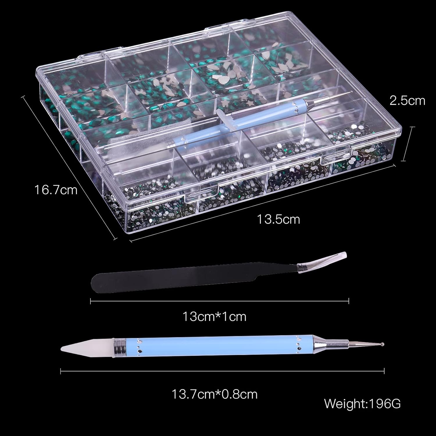 - 【SHINY CRYSTAL KIT】The professional luxury 3D rhinestones mixed 28 types,including 24 kinds of different shapes and 4 sized round rhinestones.Besides,the set is also equipped with a pretty wax pen and tweezers which can make nail decoration designs and add brilliance and charm to your nails.