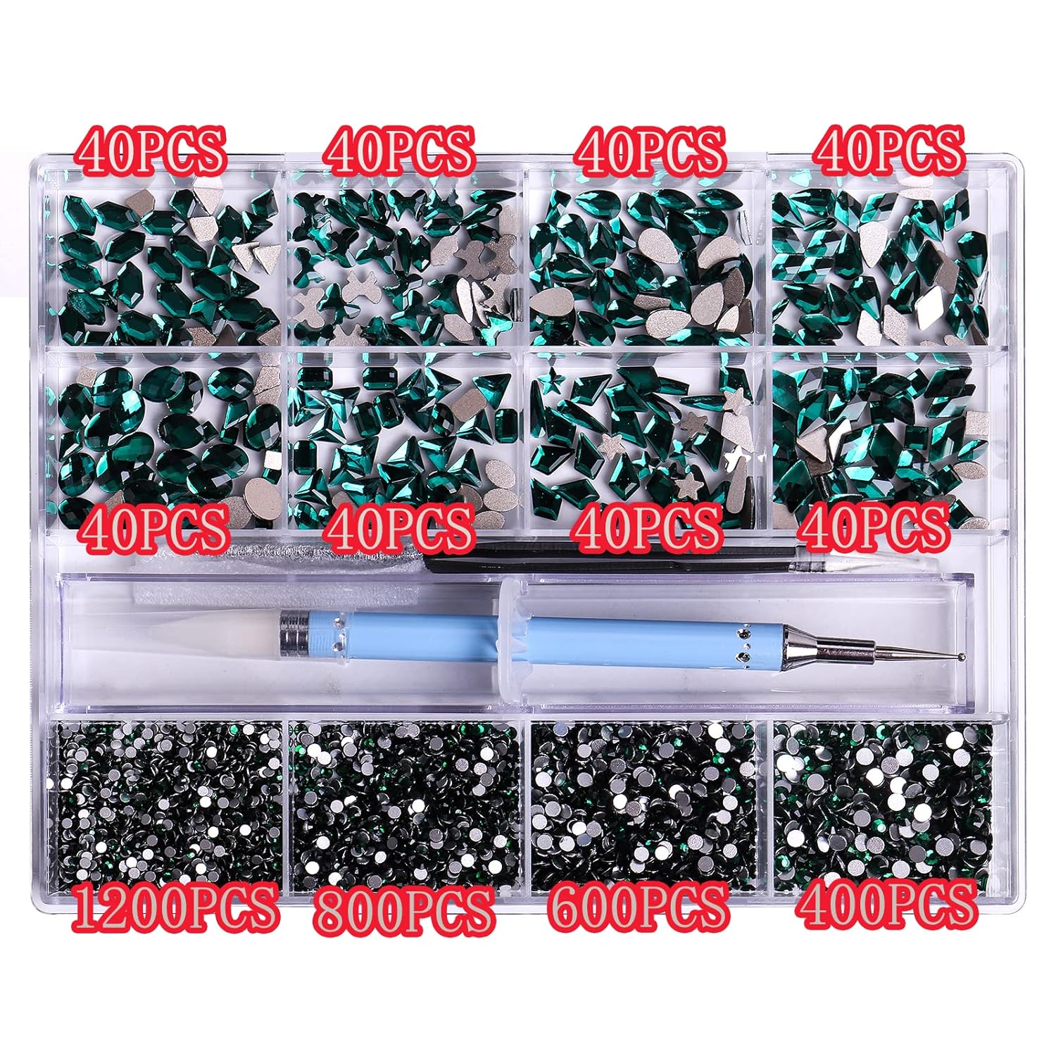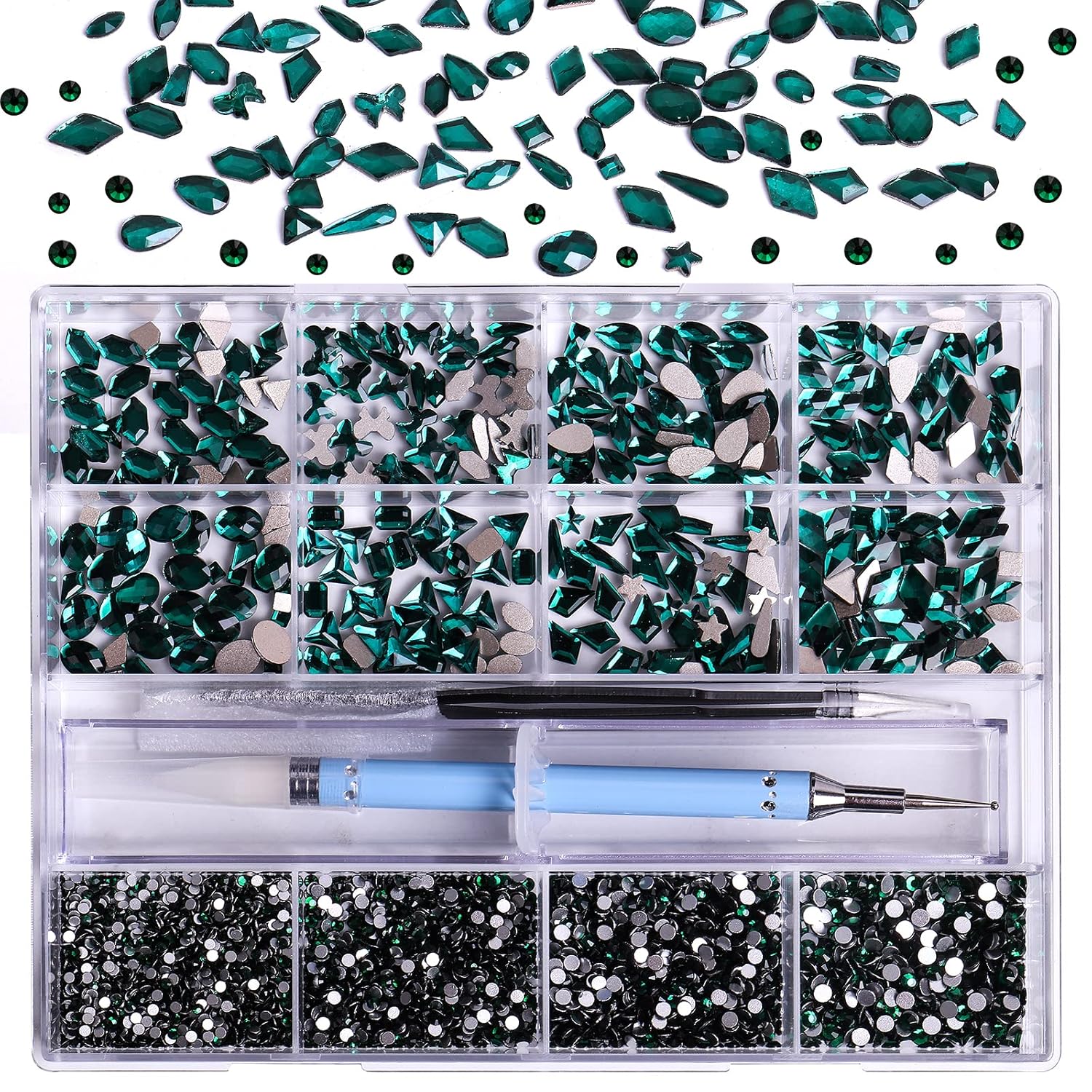 3320Pcs Green Nail Art Rhinestones Crystal,HOINCO 3D Rhinestones Gems Jewels Diamond,24 Types of 320 Diamonds + 3000 Round Beads, Crystals 3D Flat Back Gemstones for Nail DIY Crafts with Tweezers Pen