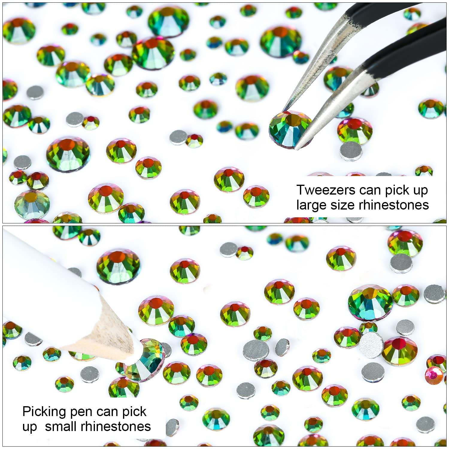 - 💎Use tweezers and Picking Pen gem picker to pick rhinestones, There is no glue on the bottom, additional nail gel is required, or other professional glue for makeup or nails. Can use E6000 super glue to fix on crafts, art decoration. not hotfix.