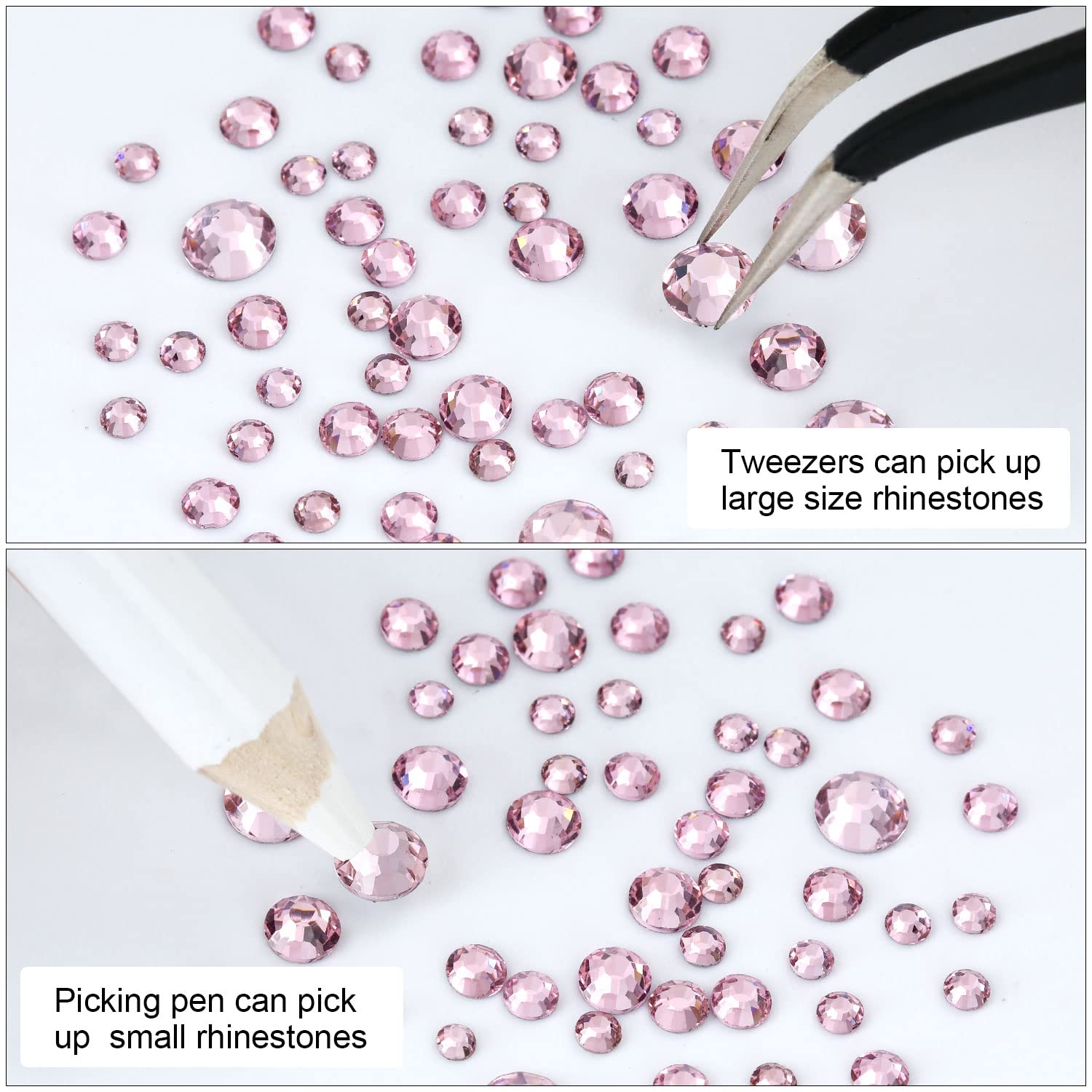 - 💎Use tweezers and Picking Pen gem picker to pick rhinestones, There is no glue on the bottom, additional nail gel is required, or other professional glue for makeup or nails. Can use E6000 super glue to fix on crafts, art decoration. not hotfix.