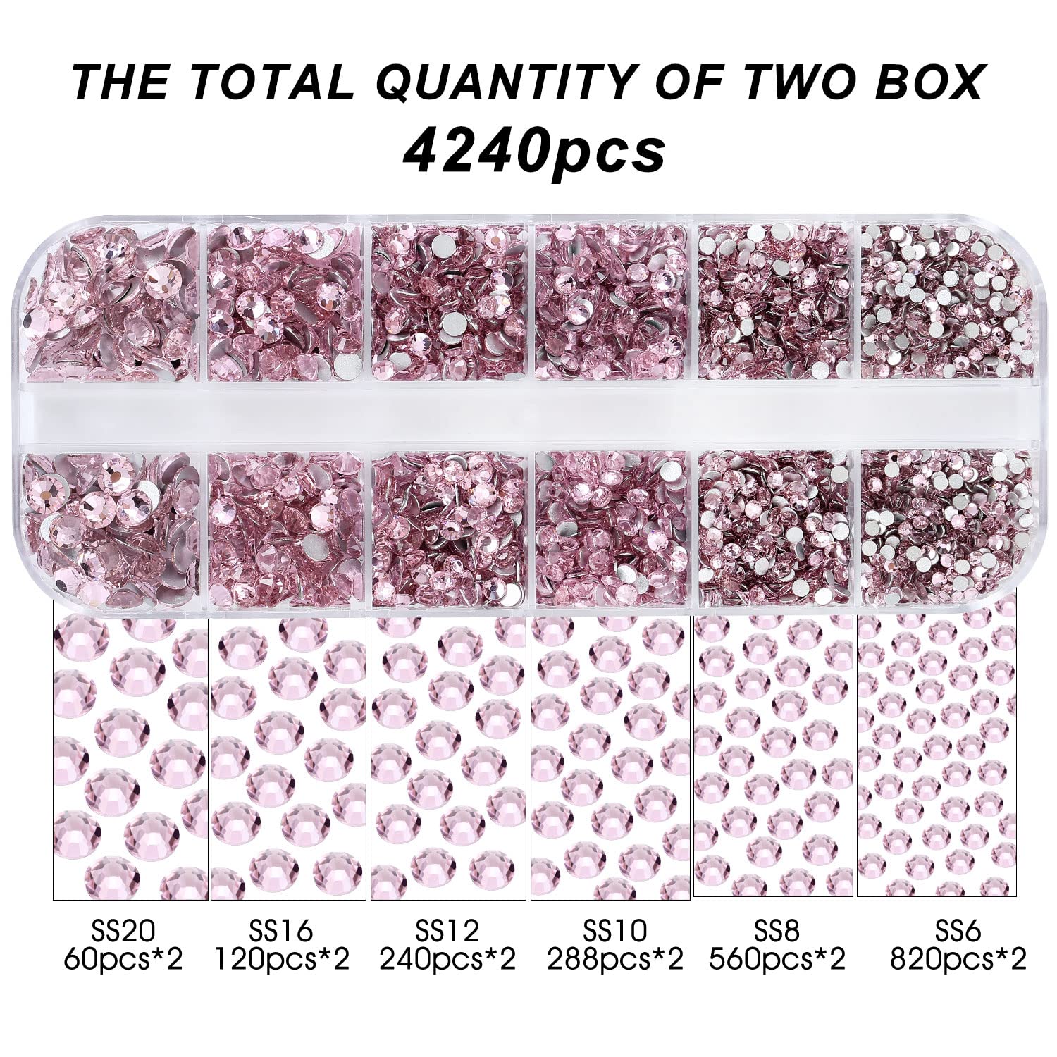 - 💎Product Packaging: Box Packaging SS6 2MM - 1680 Pcs, SS8 2.4MM - 1120 Pcs, SS10 2.8MM - 600 Pcs, SS12 3MM - 480 Pcs, SS16 4MM - 240 Pcs, SS20 4.8MM - 120 Pcs, 1 pcs Tweezers and 1 pcs Picking Pen