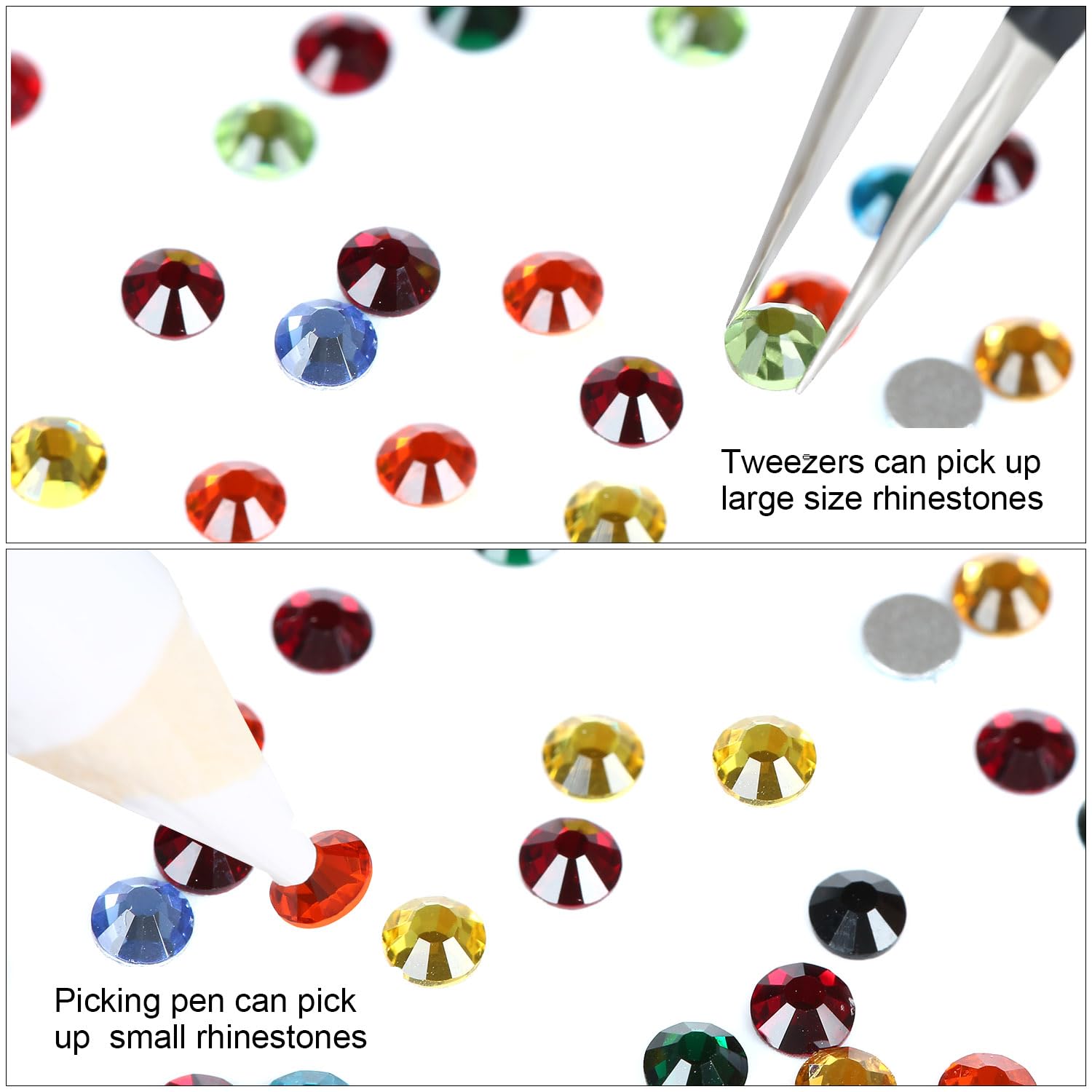 - Use tweezers and Picking Pen gem picker to pick rhinestones, There is no glue on the bottom, additional nail gel is required, or other professional glue for makeup or nails. Can use E6000 super glue to fix on crafts, art decoration. not hotfix.