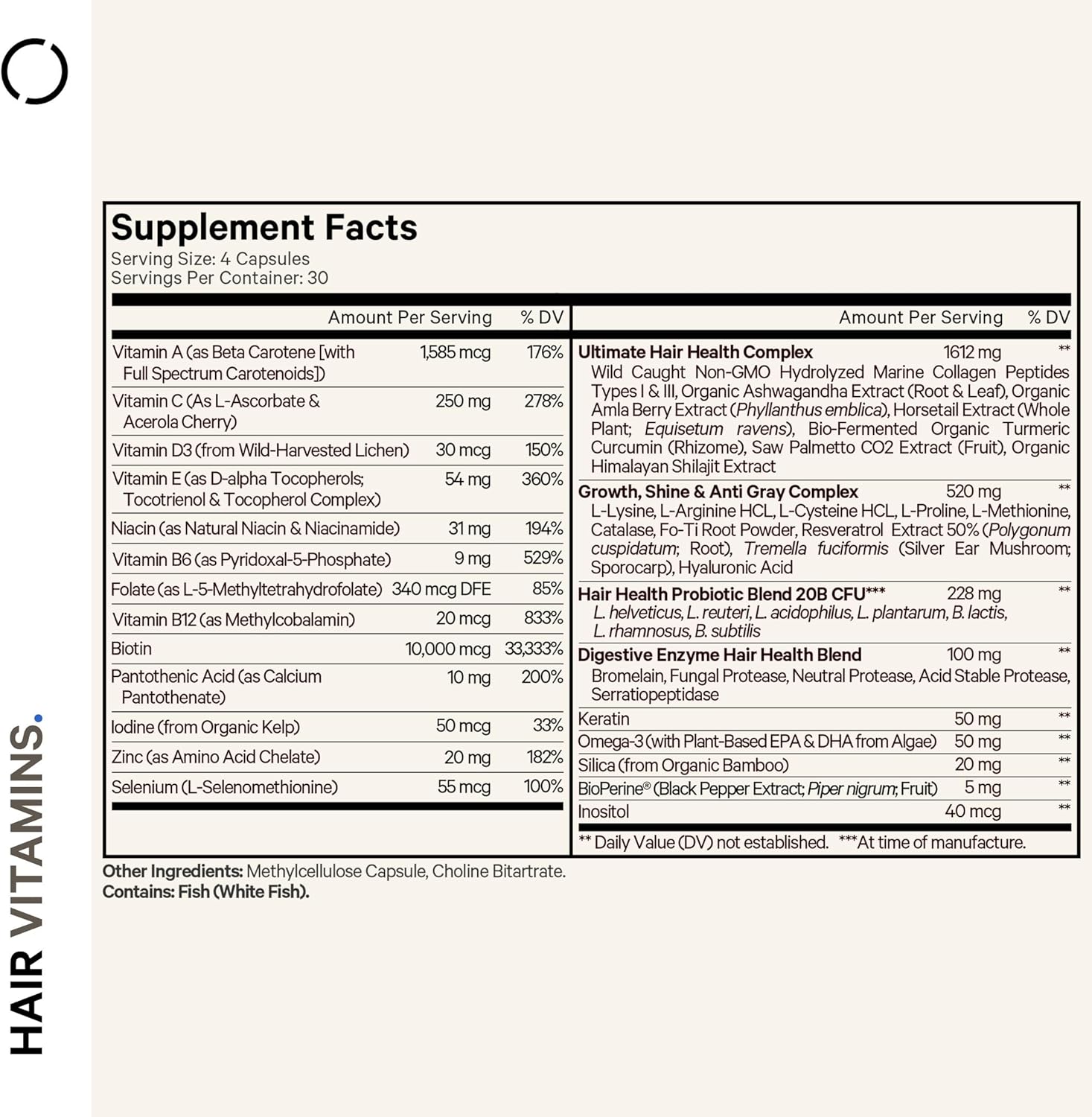 - Comprehensive Hair Nutrient Blend: Codeage Hair Vitamins supplement features 10,000 mcg of biotin, hydrolyzed wild-caught marine collagen types I and III, keratin, and essential vitamins A, B6, B12, C, D3, and Eβall in one formula to complement your hair care routine. It also includes omega-3 with plant-based EPA and DHA.