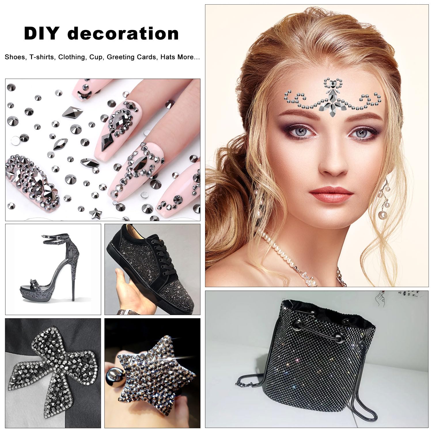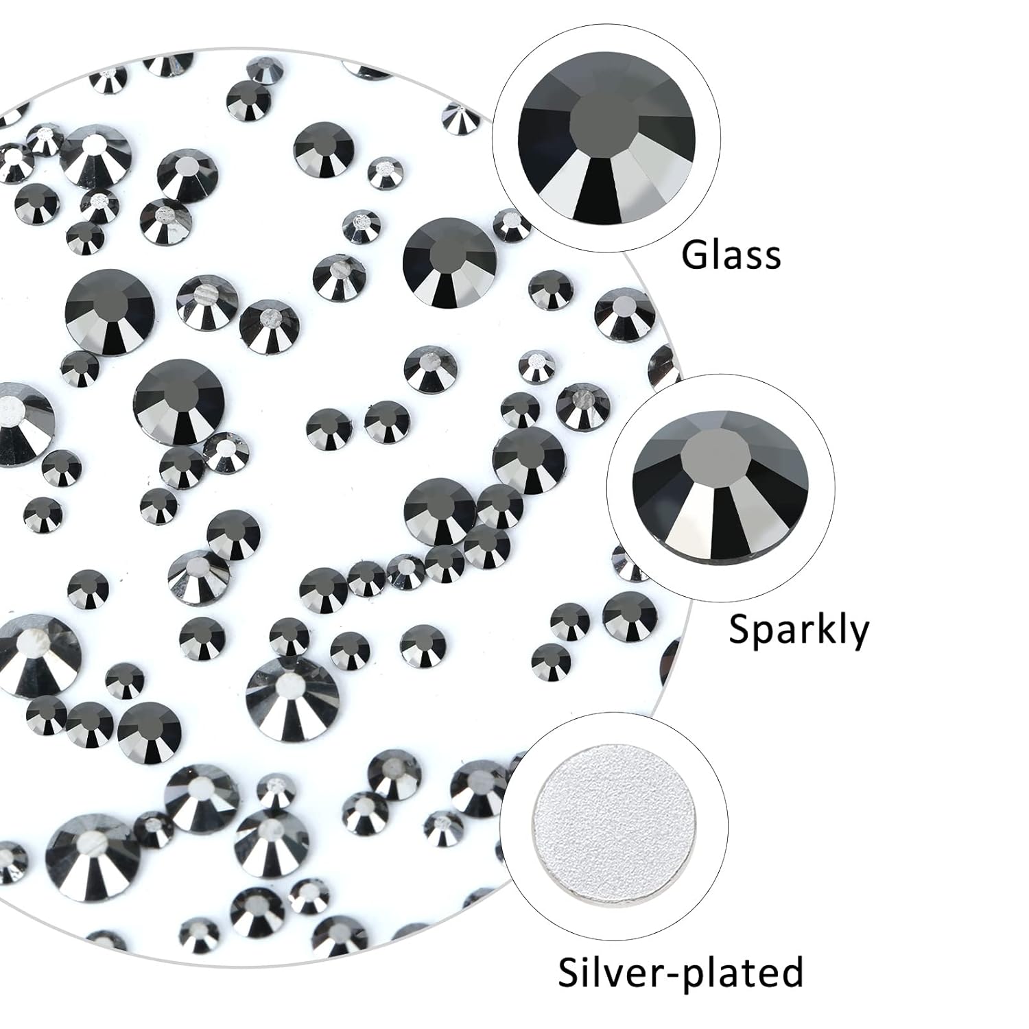 4240Pcs Jet Hematite Flatback Rhinestones 6 Sizes Crystal Diamonds for Nail Art Crafts Clothes Shoes with Tweezers and Picking Pen