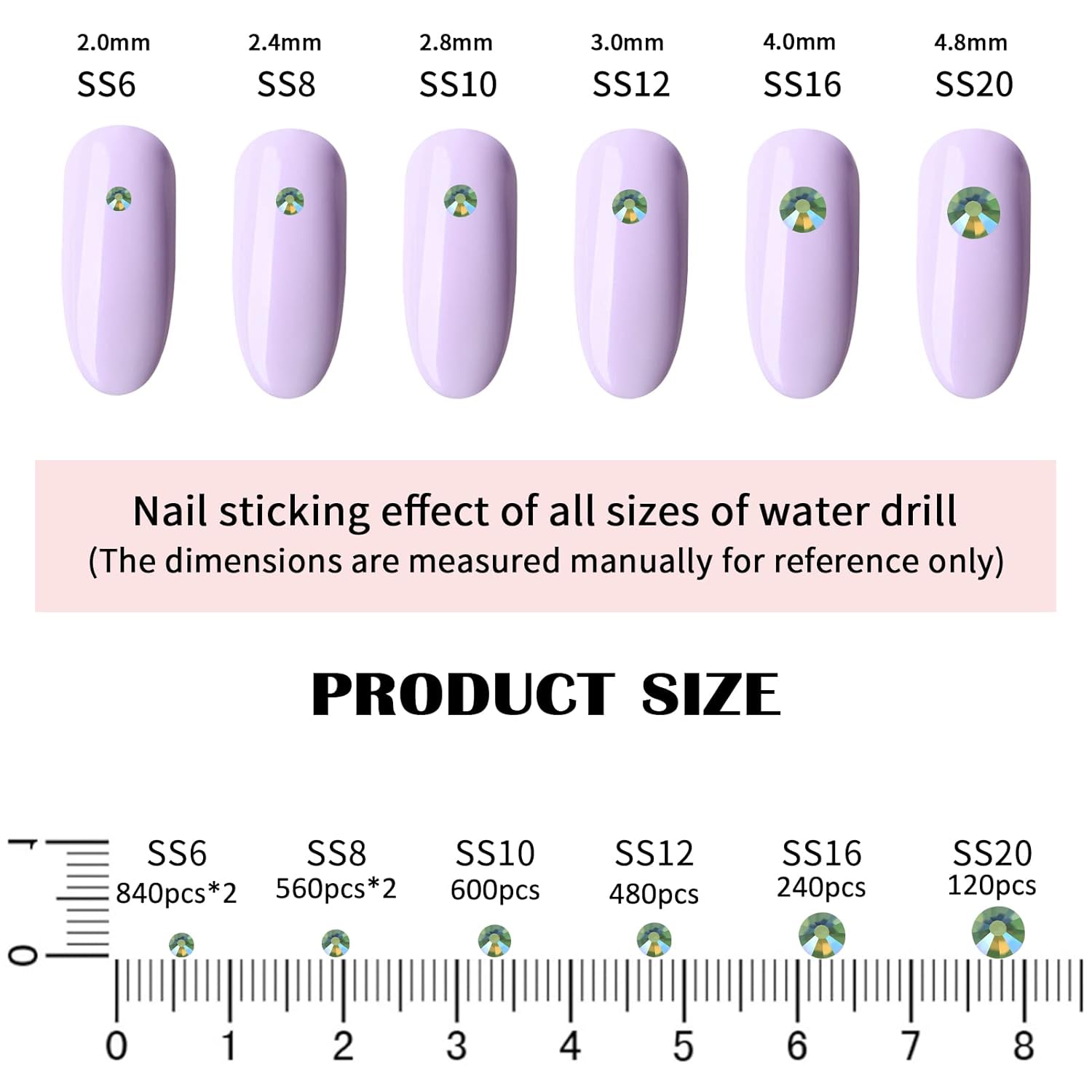 - 💎Product Packaging: Boxed SS6 2MM - 1680 Pcs, SS8 2.4MM - 1120 Pcs, SS10 2.8MM - 600 Pcs, SS12 3MM - 480 Pcs, SS16 4MM - 240 Pcs, SS20 4.8MM - 120 Pcs, 1 pcs Tweezers and 1 pcs picking pen.
