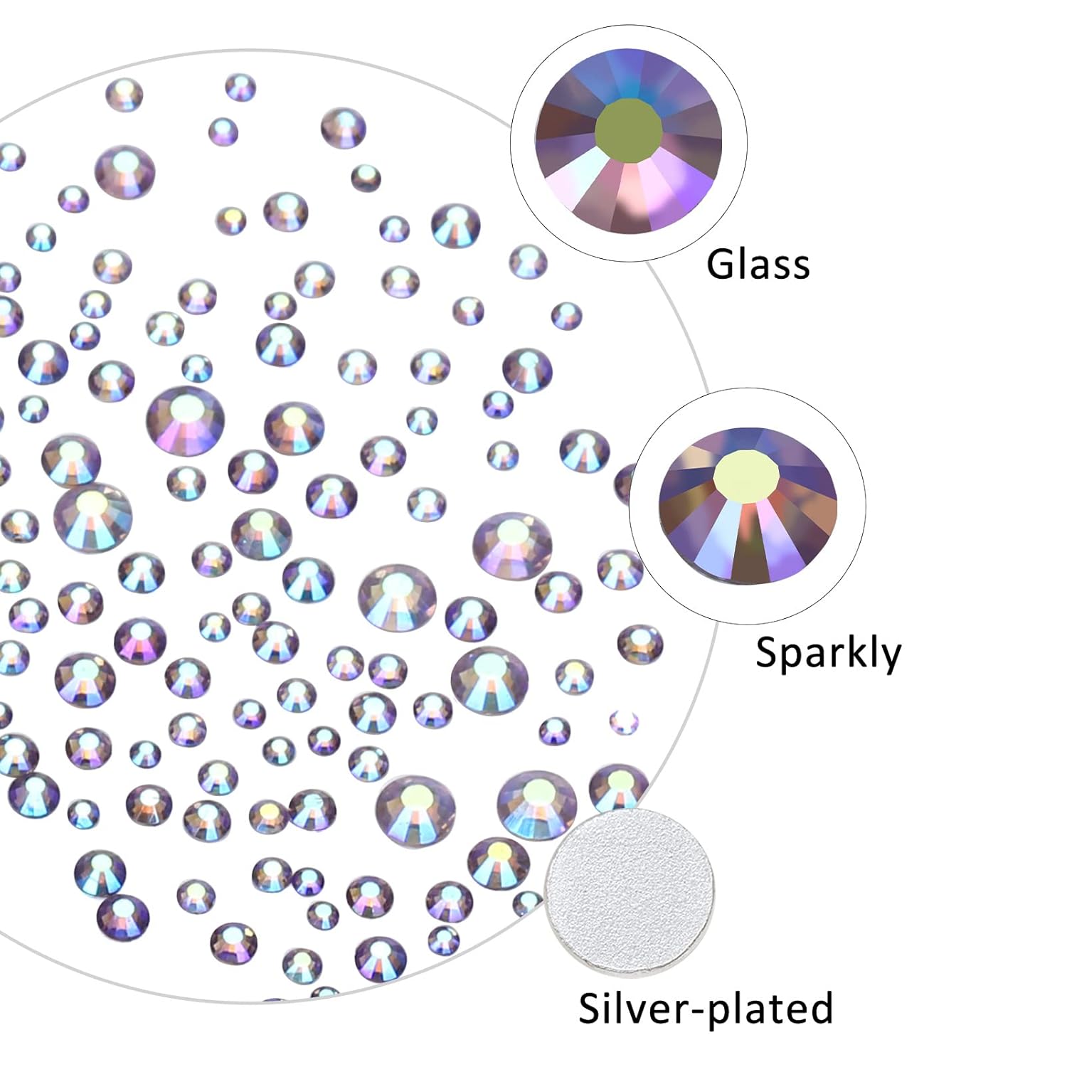 - 💎Material: glass/artificial crystal. The surface has a high-precision section, multi-faceted cutting, high brightness and high gloss. Flat bottom, round shape, silver plated back, non-allergenic. The color runs through the rhinestones without fading.