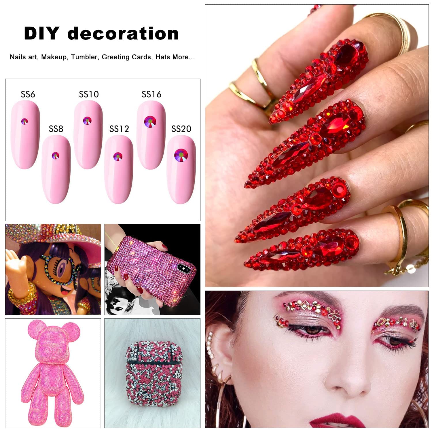 - 💎Uses: You can use rhinestones for nails, art, jewelry, skin, teeth, face, eyes, makeup, glasses, crafts, cardstock, cell phones, phone cases, plastic, glasses, etc.