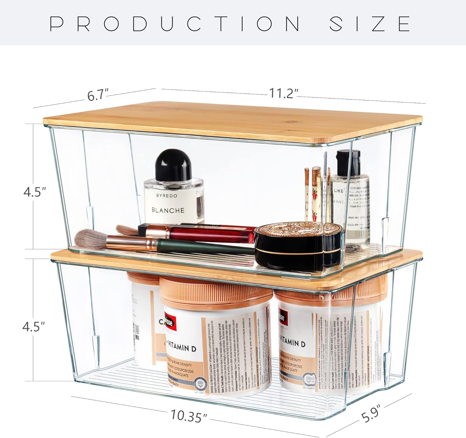 Hudgan 4 Pack Clear Plastic Storage Bins with Bamboo Lids, Stackable Storage Containers for Organizing Medicine Cabinet Organizer, Craft Room, Bread Box