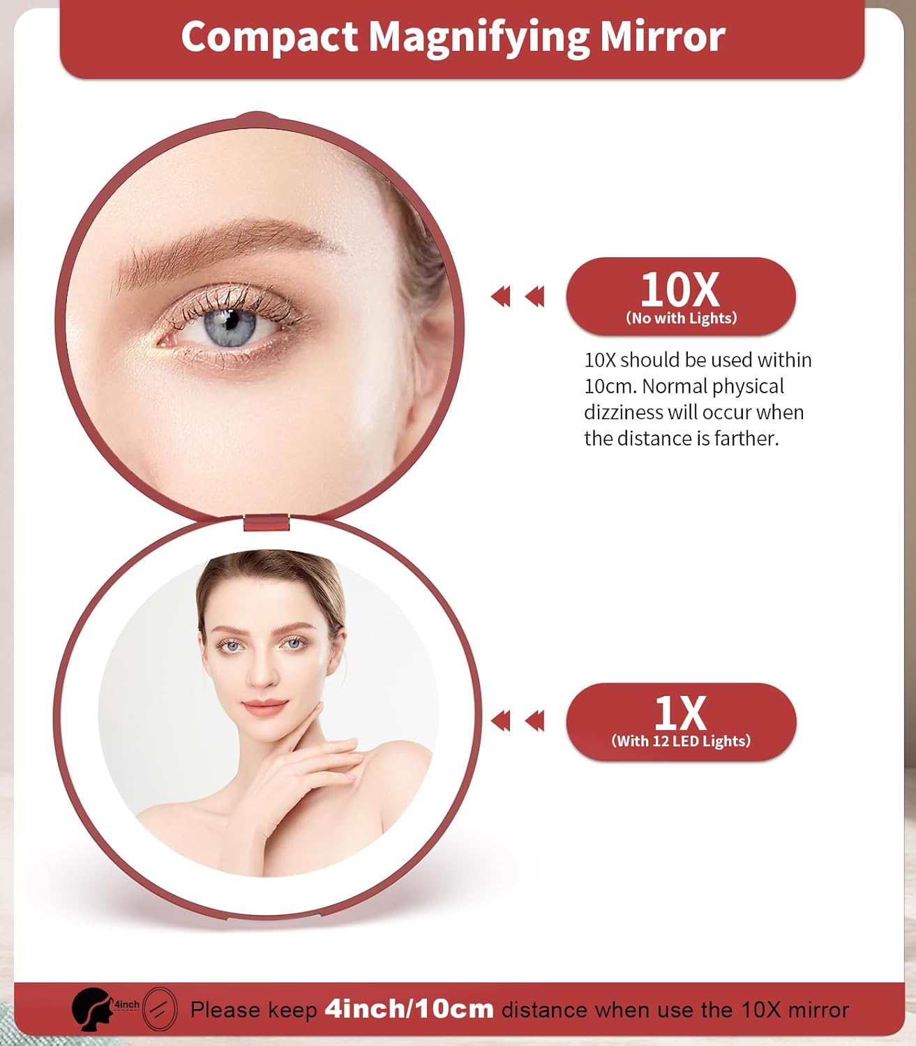 - 10x Magnifying:10x compact magnifying mirror, better magnification of facial details,which is good for makeup needs, shaving, or deep cleaning.Tip: When using the 10x magnifying mirror, please keep a distance of less than 10 cm, otherwise it may cause normal dizziness and affect imaging