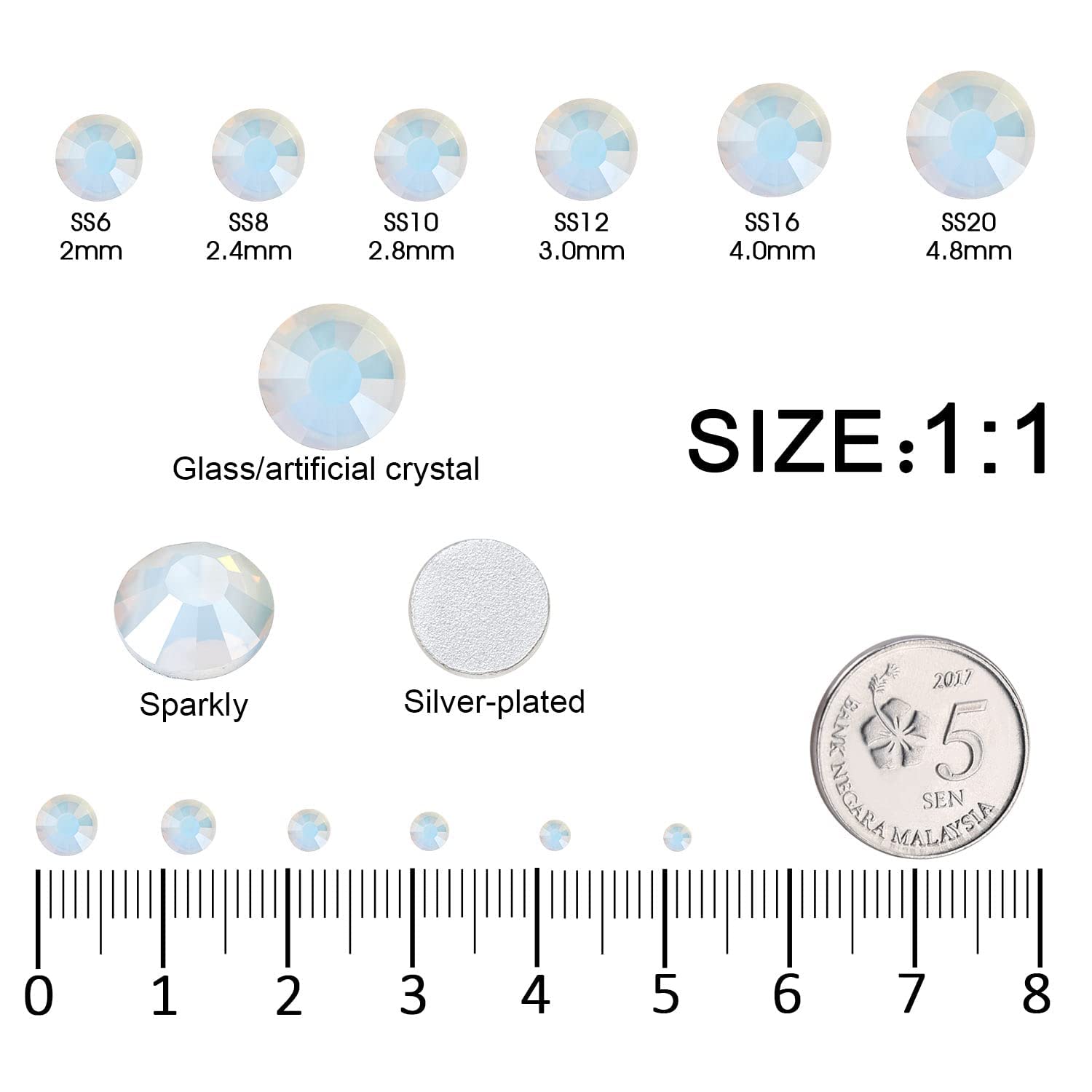 - 💎Material: Glass/Artificial Crystal. Surface High-precision cross-section, multi-sided cutting, high brightness,high Sparkly. Flatback, Round,Silver-plated back, not easy to be allergic. The color runs through the rhinestones without fading.