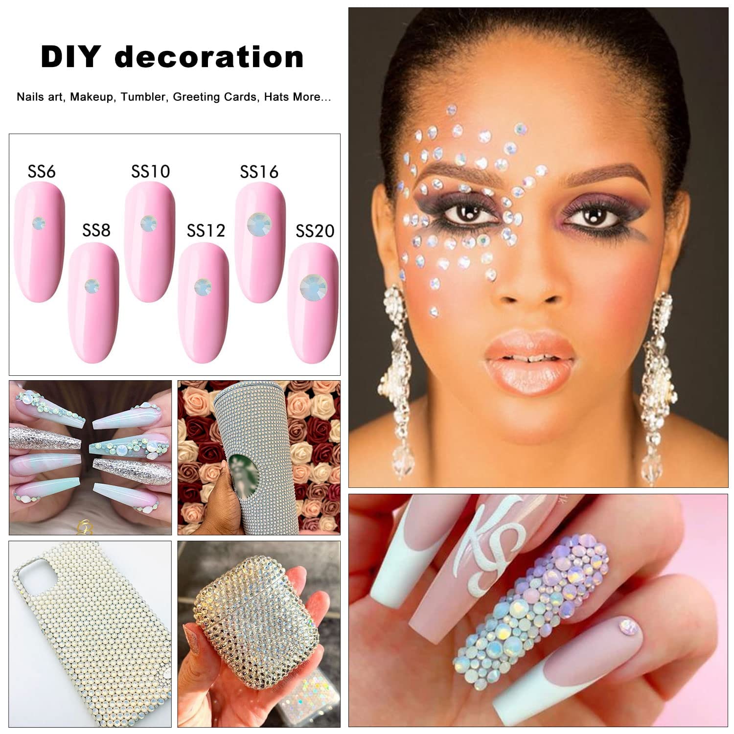 - 💎You can use rhinestones for, Nails, Art, Jewels, Skin, teeth, face, eye, Makeup, tumbler, glass, crafts, cardstock, phone, phone case, plastic, glasses etc. If you are using shoes, clothing, fabric textile type, I suggest you search on Amazon: B09ZQKTW4V