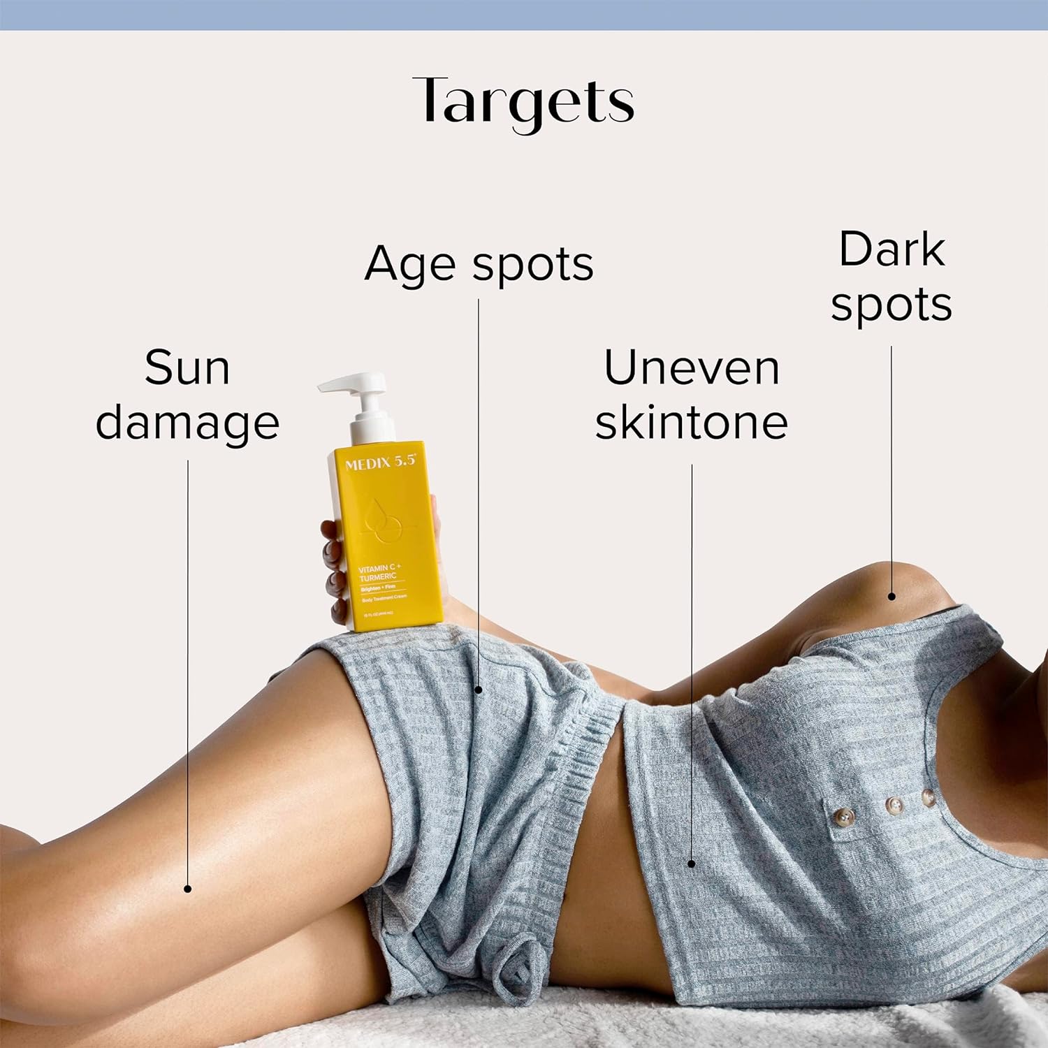 - EFFECTIVE INGREDIENTS β Medix 5.5 Vitamin C Cream Brighten + Firm Body Lotion is formulated with the perfect combination of effective anti aging + brightening ingredients, including Shea Butter, Aloe Vera, Ferulic Acid, Turmeric, Vitamin E, Glycerin, Ginger, & More. Shea Butter deeply moisturizes the skin, improves elasticity, & provides a protective barrier to help prevent moisture loss. Vitamin E helps protect skin against free radicals + UV Damage. Aloe Vera helps calm + hydrate the skin.