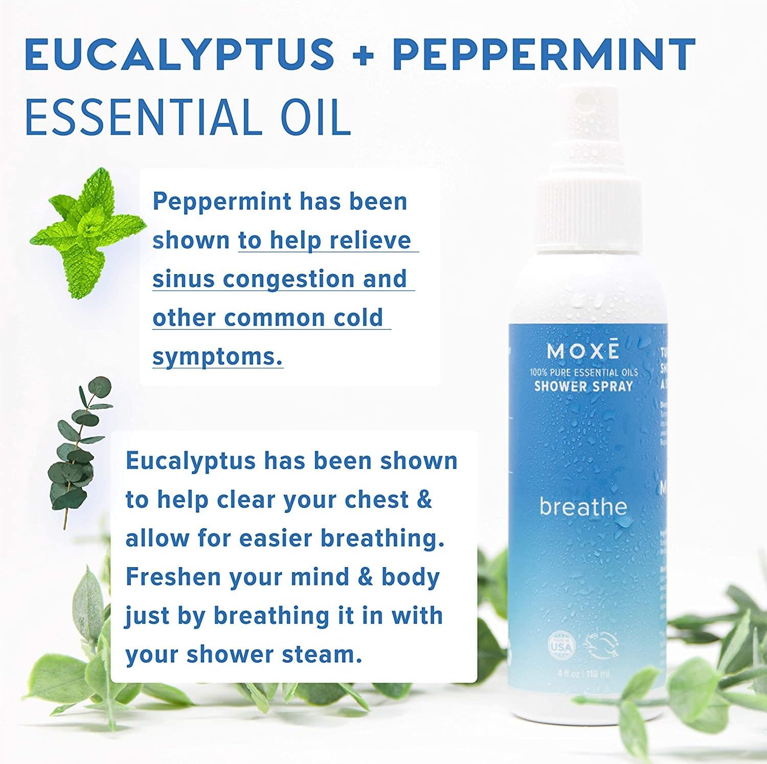 MOXE Shower Mist, Spa Steam Spray, Certified Natural Essential Oils, Aromatherapy, Tension Relief (Breathe, 4 Fl Oz (Pack of 2))