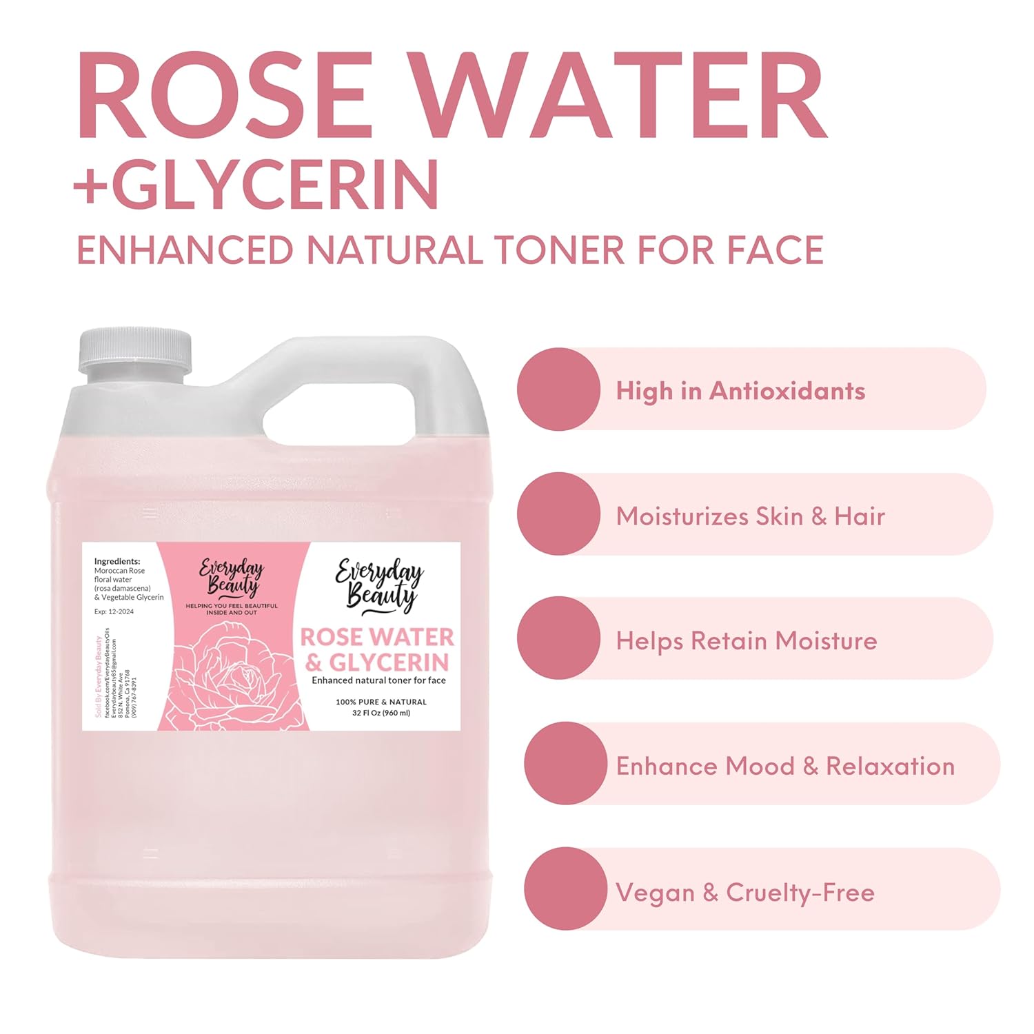 Rose Water & Glycerin Enhanced Facial Toner - 32oz Bulk Alcohol-Free Vegan All Natural Refreshing for Face and Hair - Uplifts, Calming & Soothing for All Skin Types…