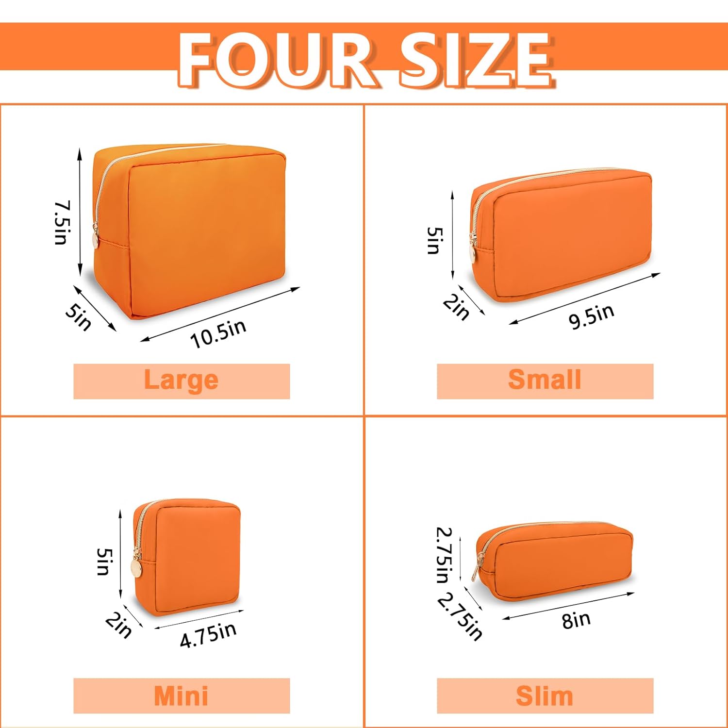 - 【Multiple Options】The cute makeup bag has four sizes, Mini(4.75''*2''*5''), Small(9.5''*2''*5''), Large(11''*5''*8'') and Slim(2.75*8''*2.75''). You can choose the right size according to the items you want to store. We have nine colors, Bubblegum, Sand, Chocolate, Periwinkle, Cotton Candy, Peach, Flamingo, Grape and Khaki. You can enjoy choosing the color you like.