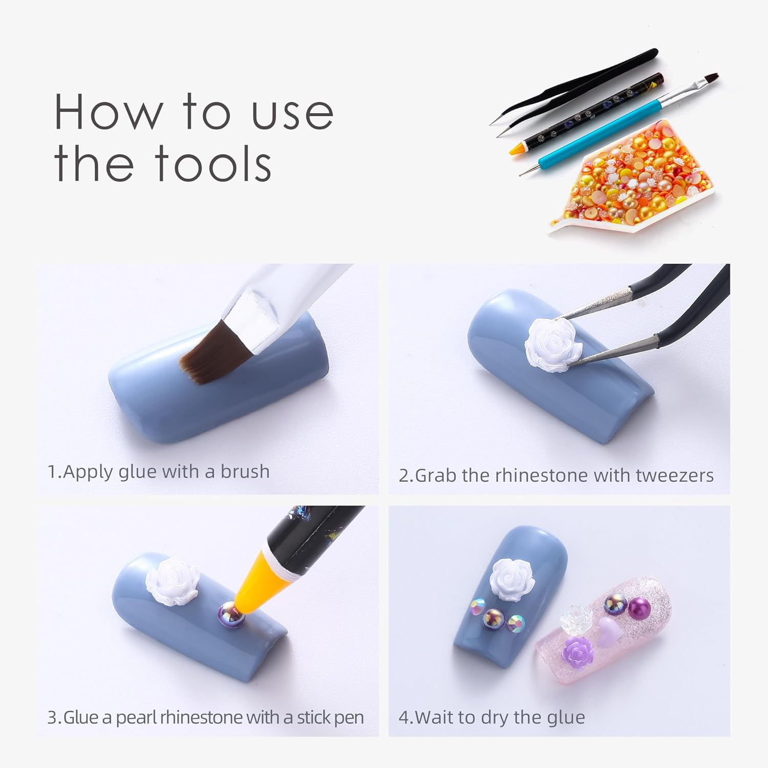 - Useful tools - These pearls and rhinestones have a flat back, which is excellent for easy placement.and you can pick up any large or small pearls and rhinestones with the crayons we bring along. And use the brush to smooth out the Gel, these tools will work very well