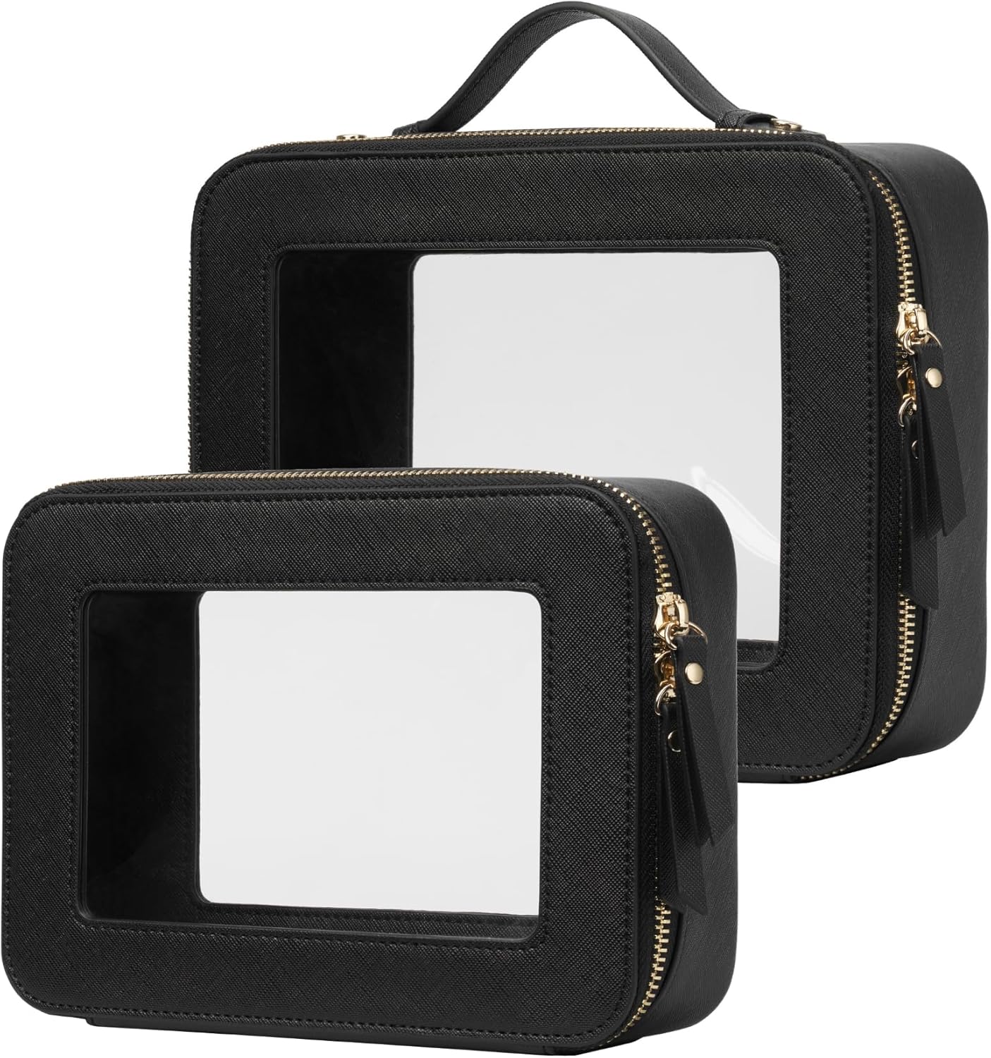- [Premium Material and Durability] β The clear cosmetic case, both the exterior and interior, is crafted from high-grade saffiano faux leather, which is highly scratch resistant, durable and exceptionally easy to keep clean. It features a smooth zipper for secure closure, and elegant light gold metal hardware accents, adding a luxurious and sophisticated touch to the bag's overall design.