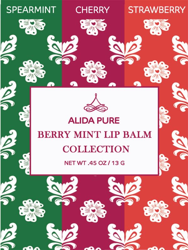 • ALIDA PURE Berry Mint Lip Balm Collection, is made with cruelty free, hypoallergenic, organic, and natural oils, that protect, and soothe. The delicious, soothing, and moisturizing, Berry Mint Lip Balm Collection, includes one tube each of Spearmint, Cherry, and Strawberry .15-ounce, lip balm tubes. Thoughtfully packaged with biodegradable materials that support the environment.