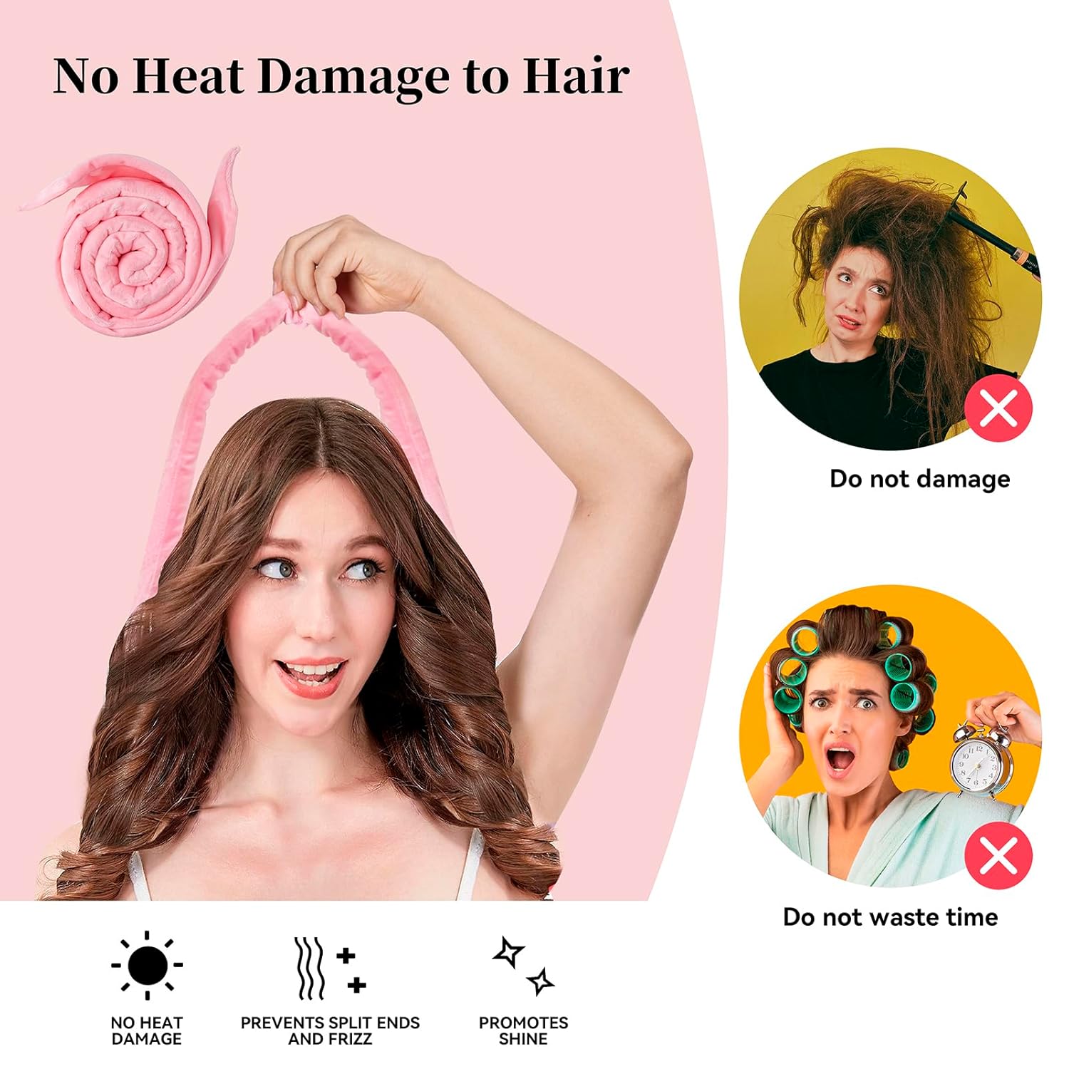 - No Heat & No Damage Hair Curlers---Heatless hair roller is to give you a new way of curling your hair created to get beautiful bouncy curls without damaging your hair with heat. The rounded edges and smooth surface will not pull or damage your hair, this heatless curls headband is your best hair stylist.