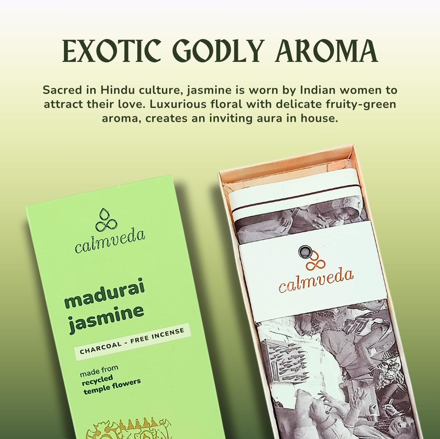 Madurai Jasmine Incense Sticks Exotic - Sensual Aroma (80 Sticks) Charcoal Free Incense, Made from Upcycled Flowers | Rich Decadent from Green, Fruity Yet Creamy Floral | Kama or Love Incense Sticks