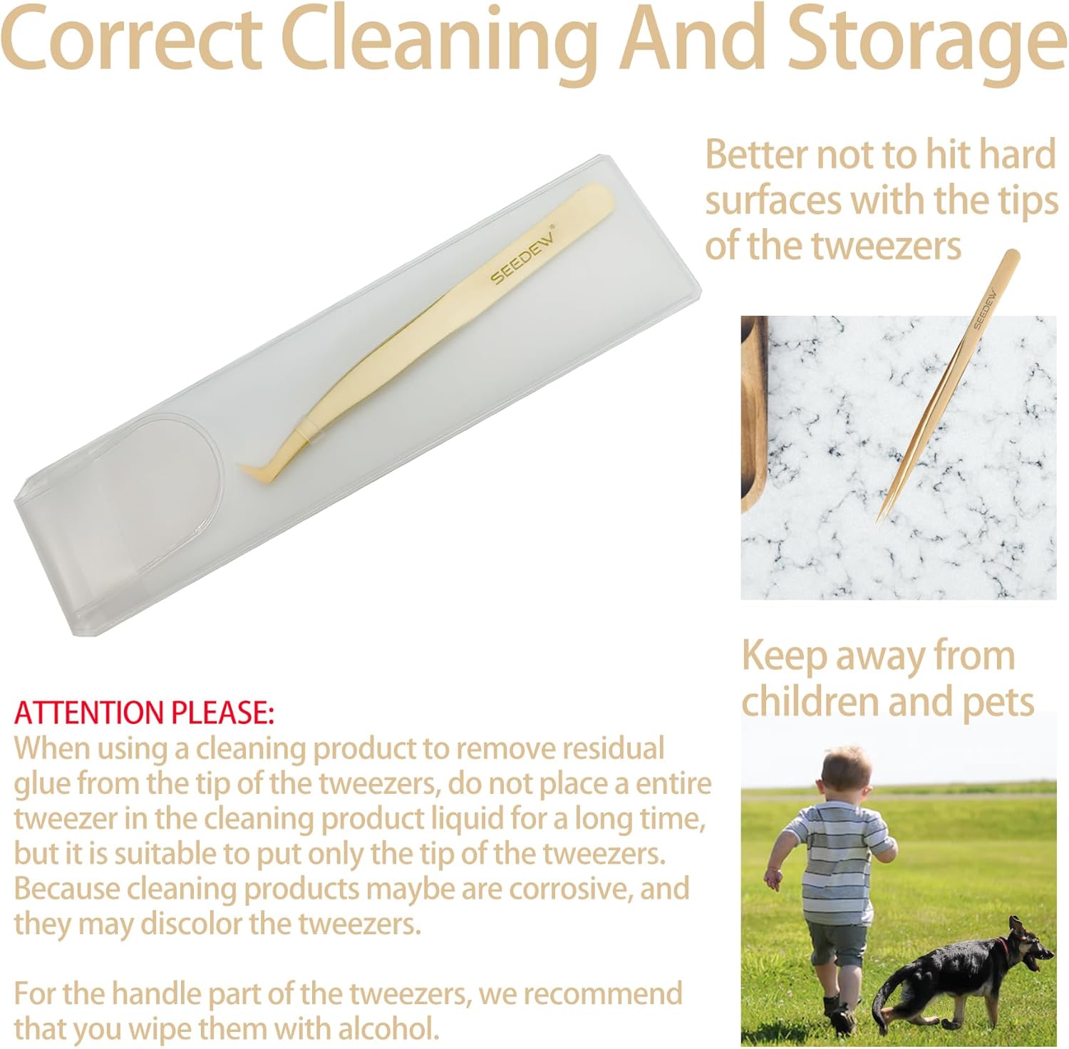 - âăPremium And ClassicăSEEDEW stainless steel golden tweezers have texture, smooth surface, classic and elegant style. 1 piece tweezer is equipped with a protective case, which is safe for storage, dustproof, dropproof, and imitation of poking.
