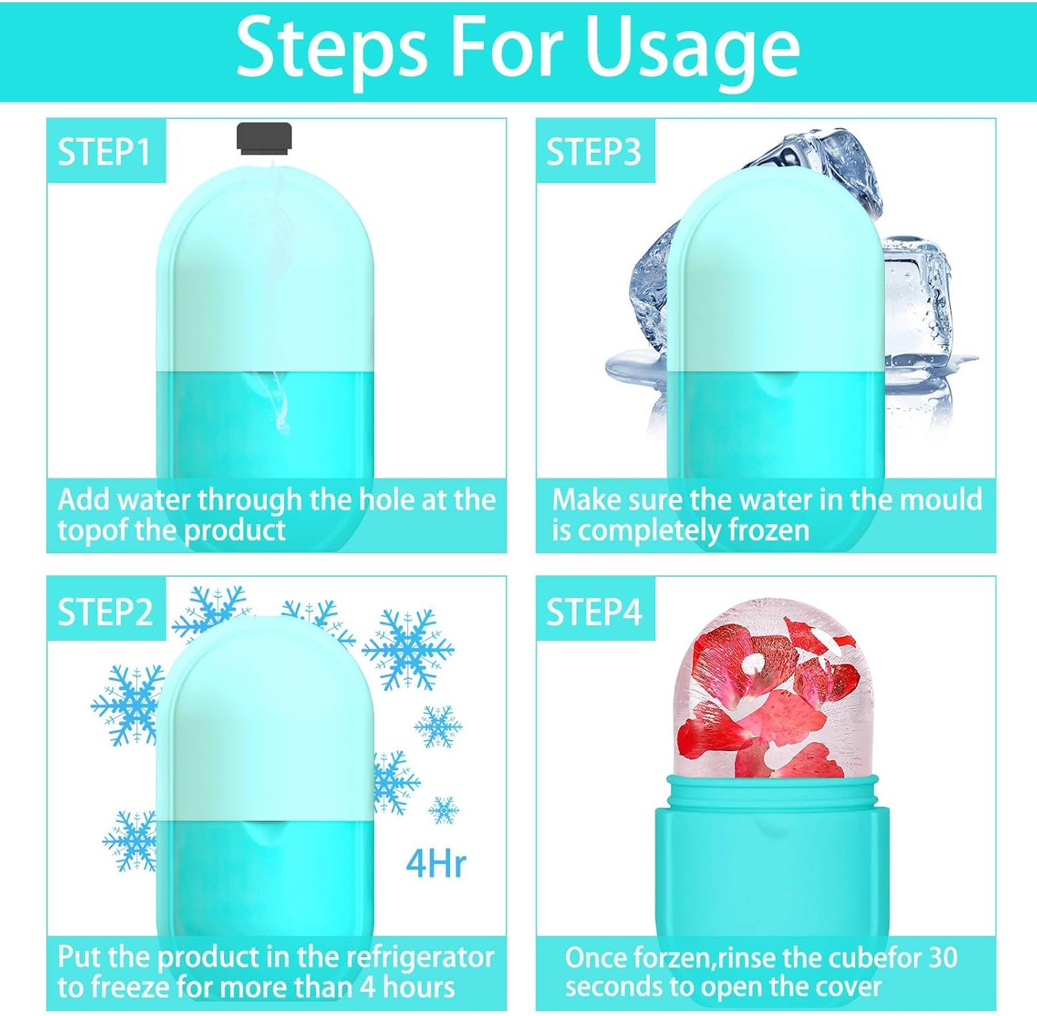 - 💞【Easy to use】 EASY TO USE: Fill the ice roller massager mold with water. Freeze in refrigerator for more than 4 hours,when using it apply the ice to your skin in 30 second intervals in circular motions. For optimal results, It is recommended to use 1 or 2 times a day.