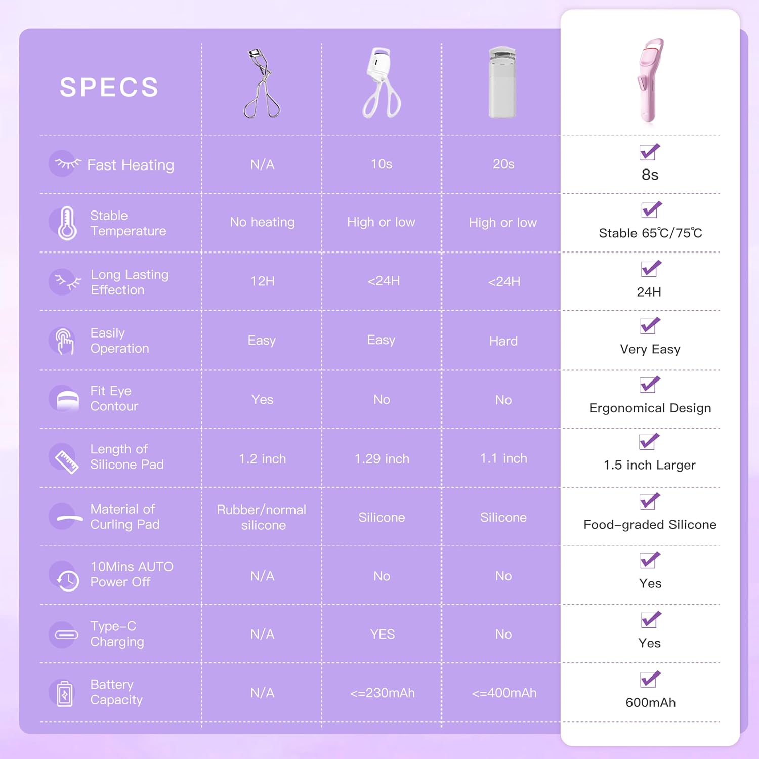 - ADVANCED SMART TEMPUTURE CONTROL SYSTEM: Heating Eyelashes Curler make the accuracy of temperature is improved 60%, achieved the curling temputure fluctuating only at +/-3 Β° after fully warm up, not +/-10 Β° like others heating eye lash curlers. more stabilized curling temputure offer quantity of heat to get better curling result and long lasting.
