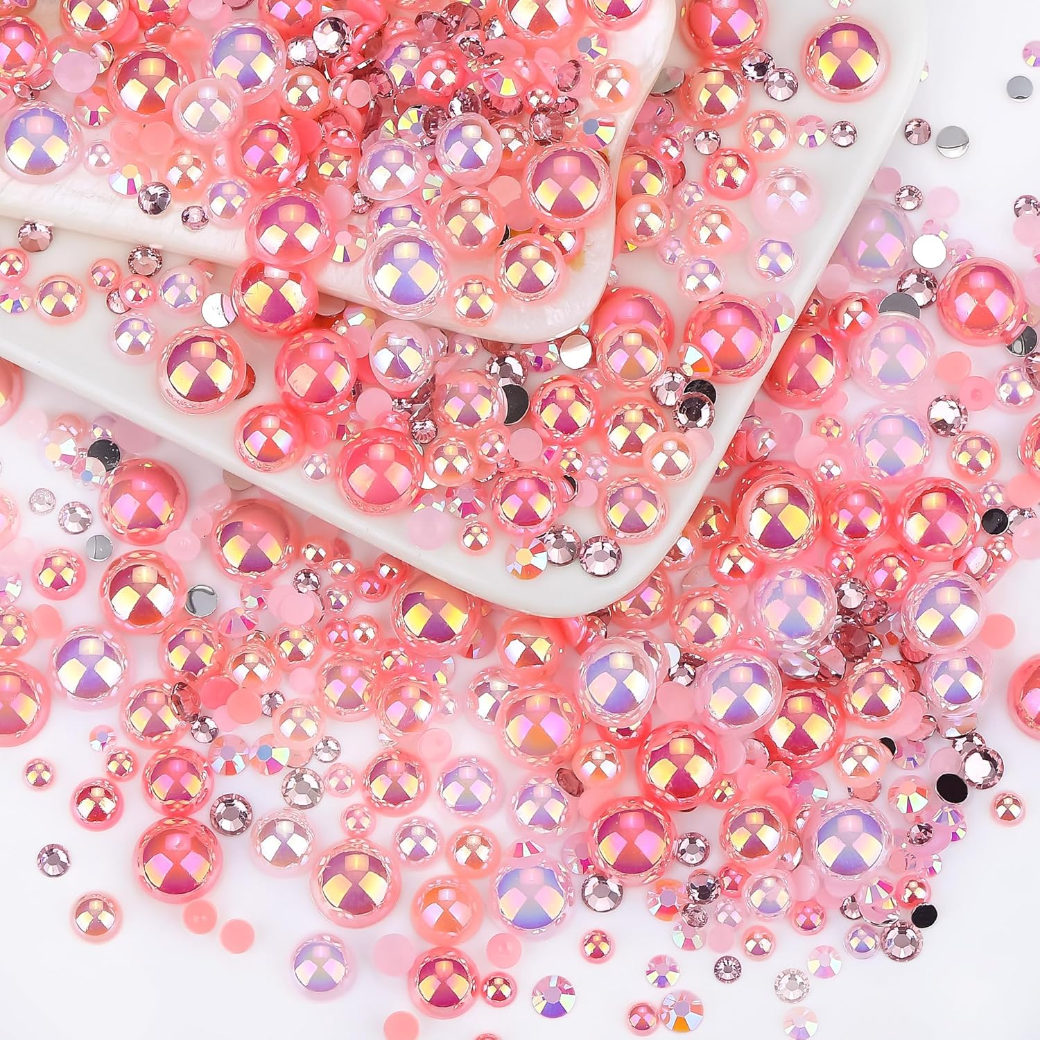 60g Pale Pink Flat Back Pearls Rhinestones for Crafts Mixed Size 3mm-10mm AB Color Round Half Pearls Flatback Pearl Beads and Resin Rhinestones Set for Face Art with Gle