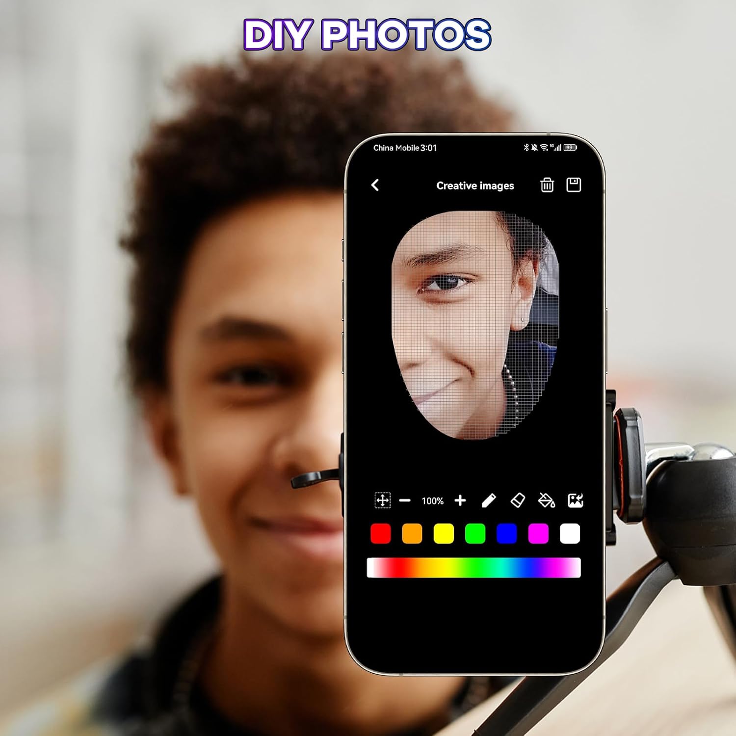 - Multifunctional LED Mas k- Easily control the mask's lighting through the SHINING DISPLAY APP on your phone. You can add photos or DIY text to this LED mask. If you play music in the app, the audio will be displayed on the glowing mask.