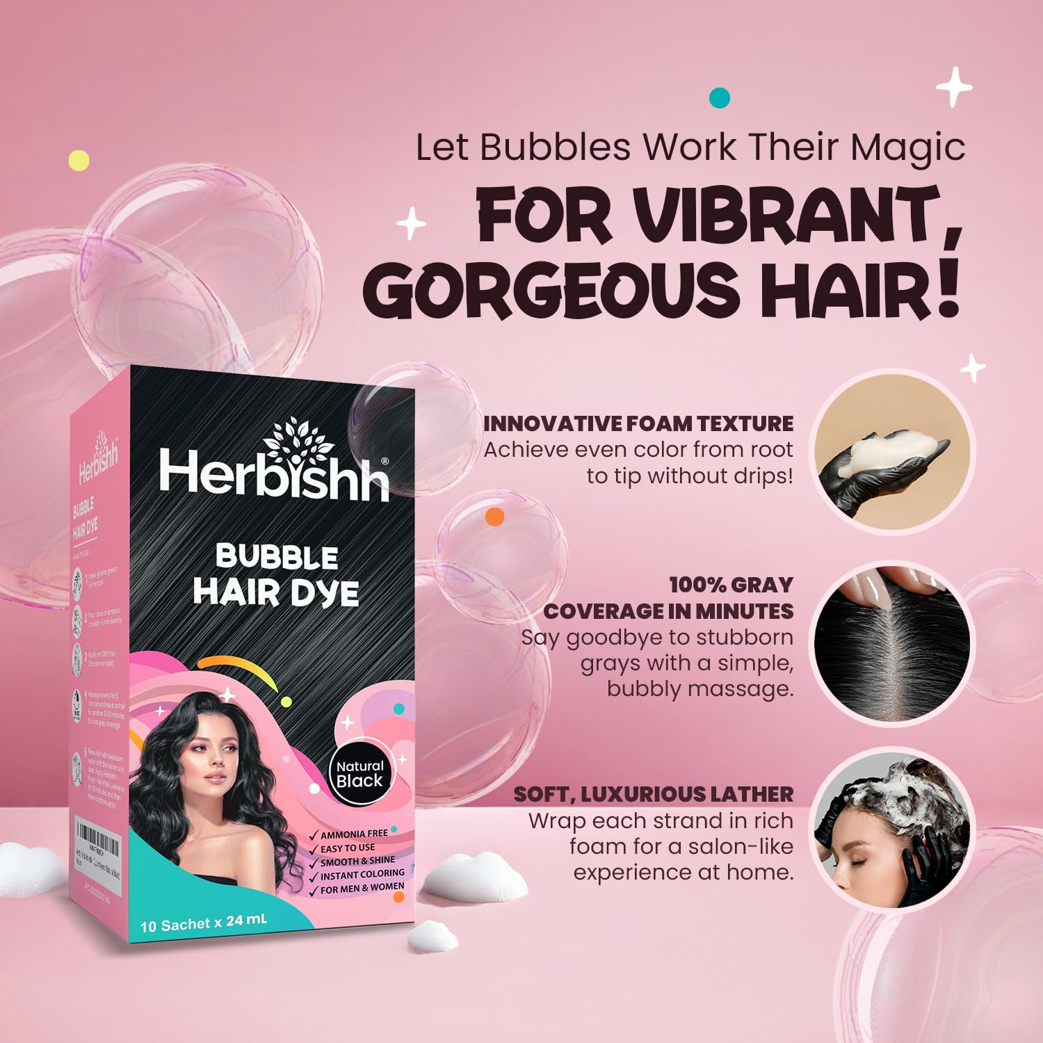 Herbishh Bubble Foam Hair Dye Shampoo, 3 in 1 Dye for 100% Grey Coverage, Permanent & Instant Hair Coloring for Men & Women, Long-lasting & Travel-friendly, Ammonia-free, 10 Sachet x 24 ml (Black)
