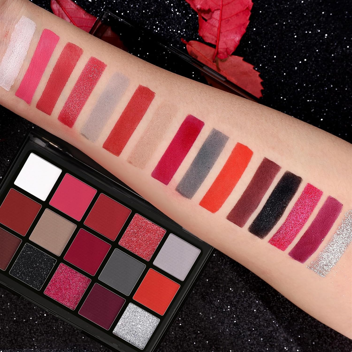 - ❤ . Shadow pallet perfectly mix of rich pressed pigments to feed your makeup obsession. These colors features true fresh red, Burgundy, slight shimmery black and matte white shades, light and dark gray, camel matte, and also with dramatic glittery red and icy reflective metallic foils, This is the ultimate collection for anyone who loves passionate colour.